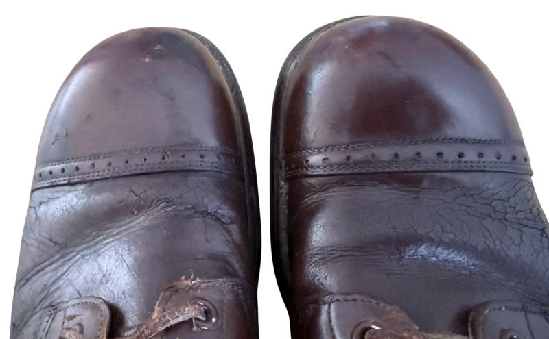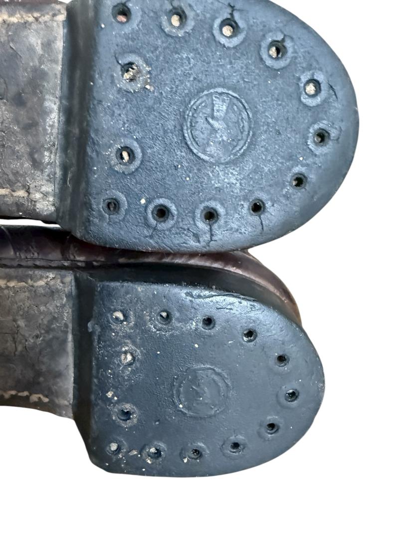 Produced by one of the larger contractors for these iconic jump boots. This particular pair of boots is makers marked Corcoran. Both stamped "Corcoran Stoughton" in the leather liner of the boots. Fitted with original "Goodyear" soles in equal nice used condition. The boots compromise a large size 10 D.