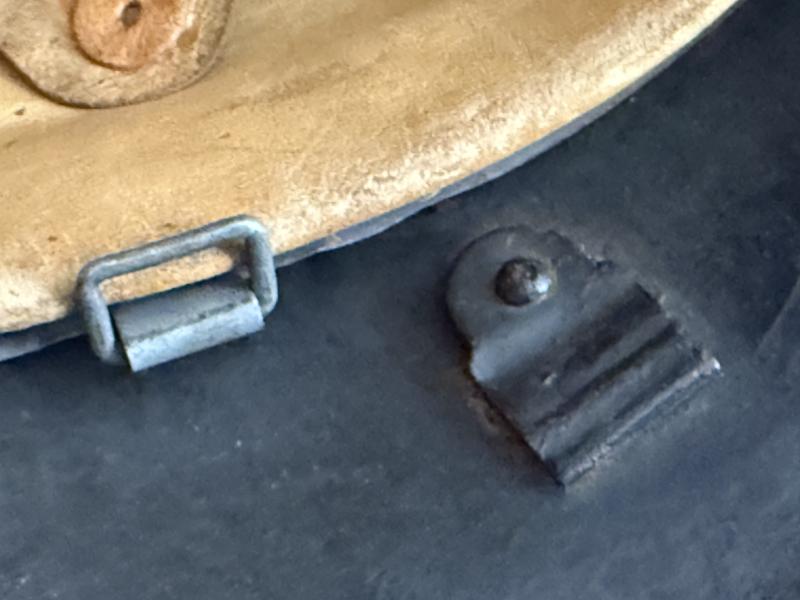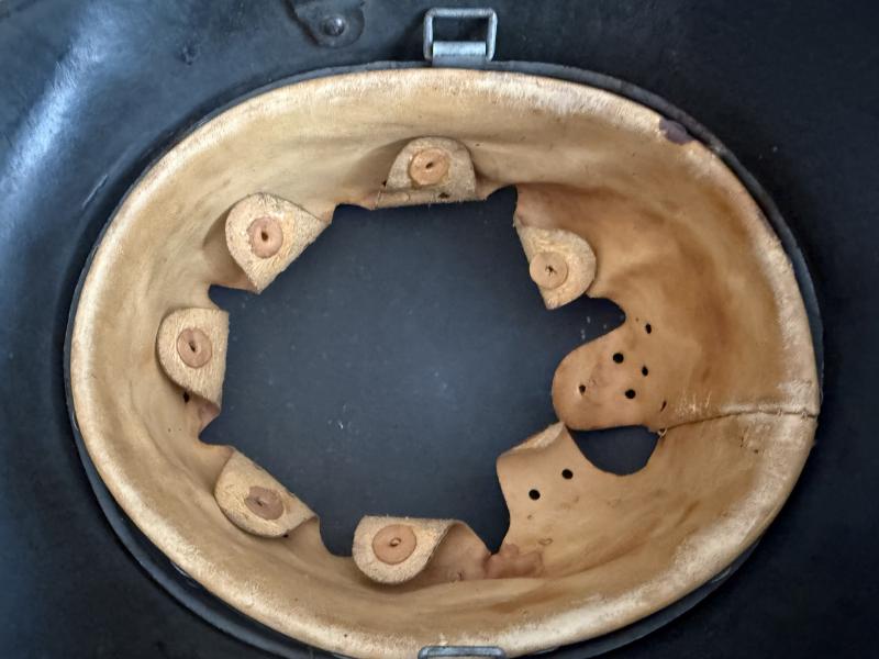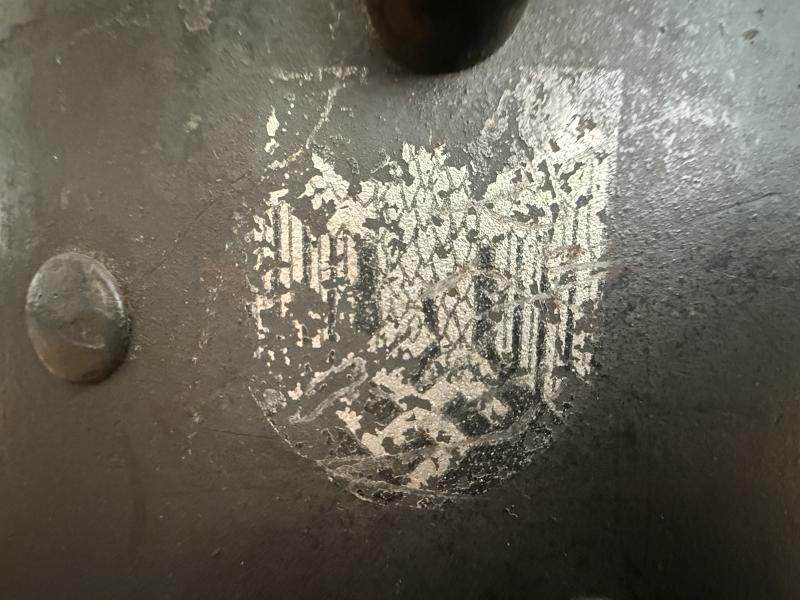 WH (HEER) M17 Helmet, or often refered to as transitional helmet. These first world war helmets were reissued and applied with Third Reich decals. The Wehrmacht decal is still present and for a good 70% visible. The liner is present and the leather in good supple condition, marked a size 57. This is a clear nice used helmet with a great patina. Can be upgraded however.