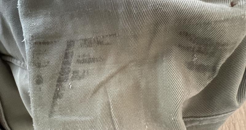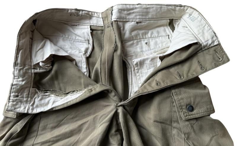 The M1942 jacket has some clear trace of wear and is fitted with an original yet washed out label I would estimate a ./36R / 38R The original "Prentige" zip,is in full working order(one of the knive pocket Zips is brokenThe and the original often displaced waist belt is present. All press studs are in full working order. The trousers are marked with a laundry number V4393 in the lining and equally have some trace of wear and age. The original label is present but mostly washed out. There appear to visible markings in either the jacket or the trousers yet both compromise a decent mannequin size. With the trousers measure around 40cm in waist and 110cm in lenght. A textbook U.S. (Airborne) M1942 Jump Jacket & Trousers with great patina.