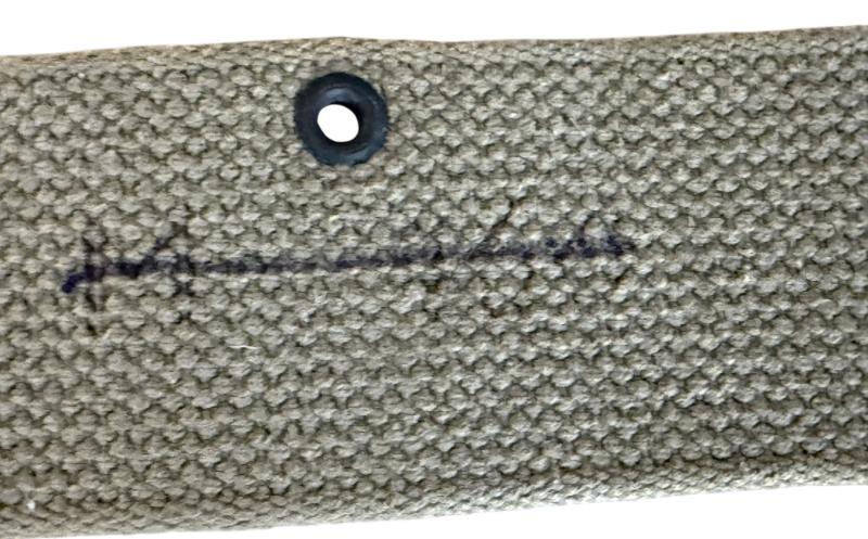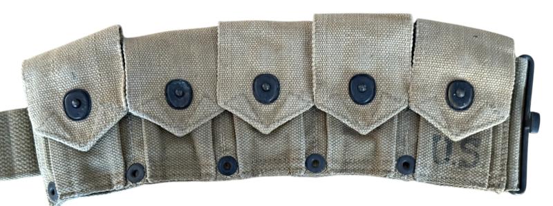 U.S. M1923 Garand Belt, executed in khaki canvas ans U.S. marked on front of the belt. In overall nice used condition with some trace of wear and age. The belt appears makers marked D.M. Shoe Co. and 1942 dated. An overall nice used U.S. M1923 Garand Belt with a good patina.