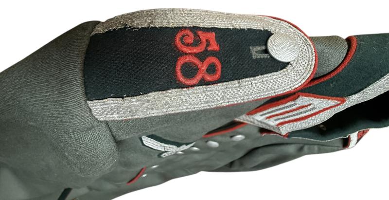 WH (Heer) Cavalry M35 Dress Tunic (Wehrmacht Parade-Waffenrock) as intended for a NCO. The Dress is lined in red 'Waffenfarbe' (branch of service). Red being for Artillery. Original mounted with silver thread breast eagle.The silver NCO tread is machine-sewn around the collar. The tunic is complete with a pair of original sew-in type shoulderboards. The shoulderboards are marked "58" i.e. attached 58th Regiment. The tunic does not have any visible size or makers mark, yet a decent manequin size. There is some minor wear to the jacket adding to its patina. An overall highly atttractive WH (Heer) Artillery M35 Dress Tunic.