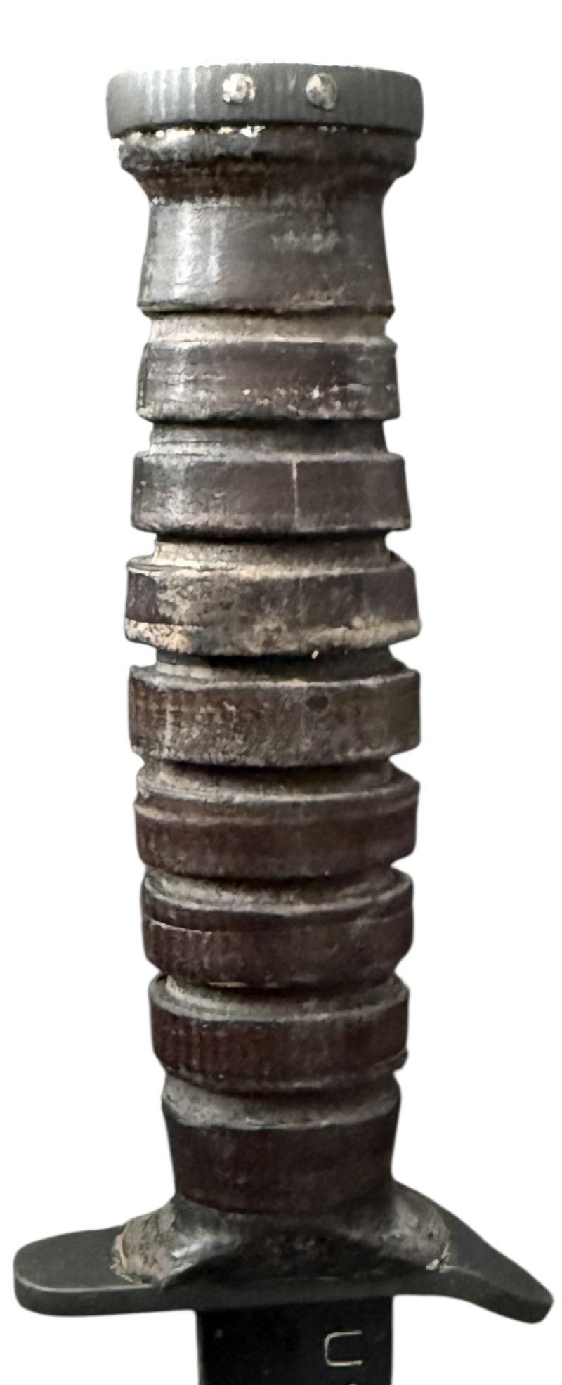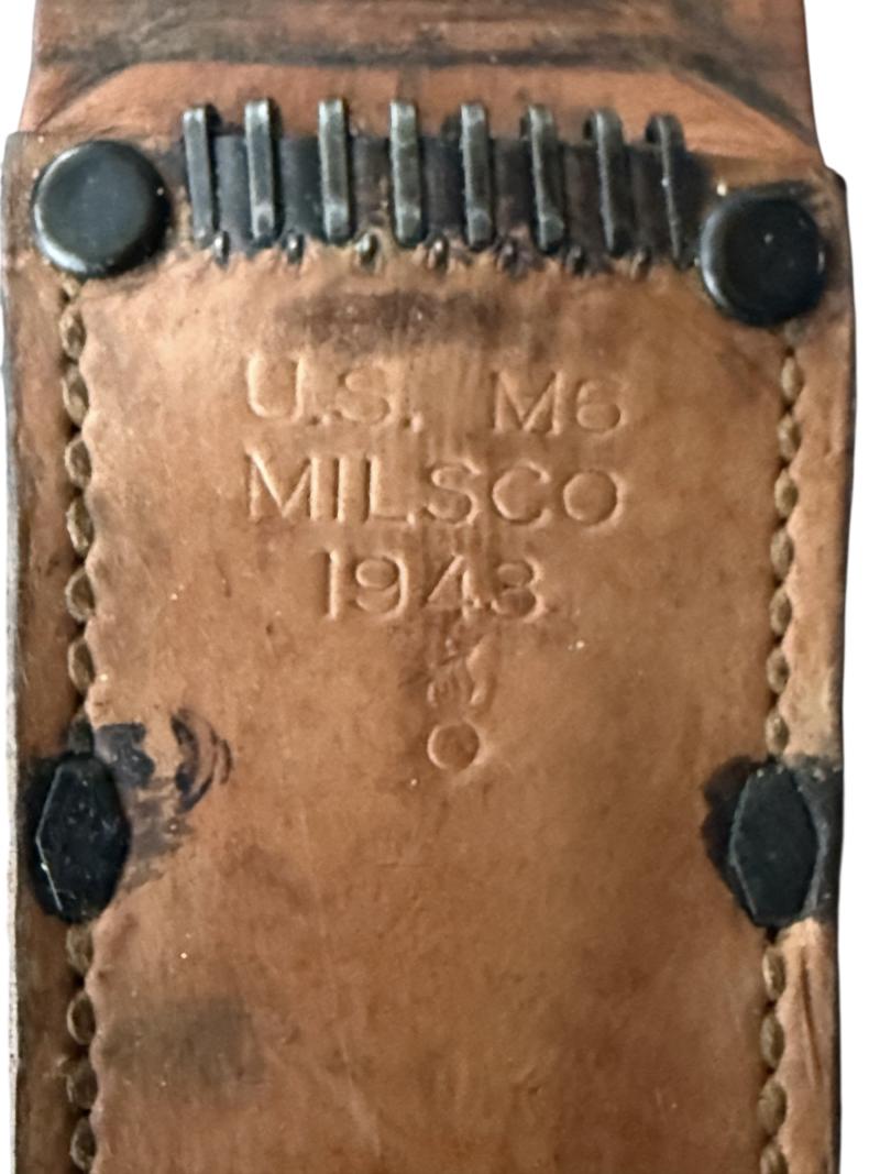 With the knife comes an equal nice i.e. light used M6 leather scabbard. The scabbard is marked U.S. M6, makers marked Milsco Co. and 1943 dated. Increasingly hard to find these days. An attractive U.S. first Model M3 Trench Knife "Camillus" With M6 Leather Scabbard in a hard to upgrade condition.