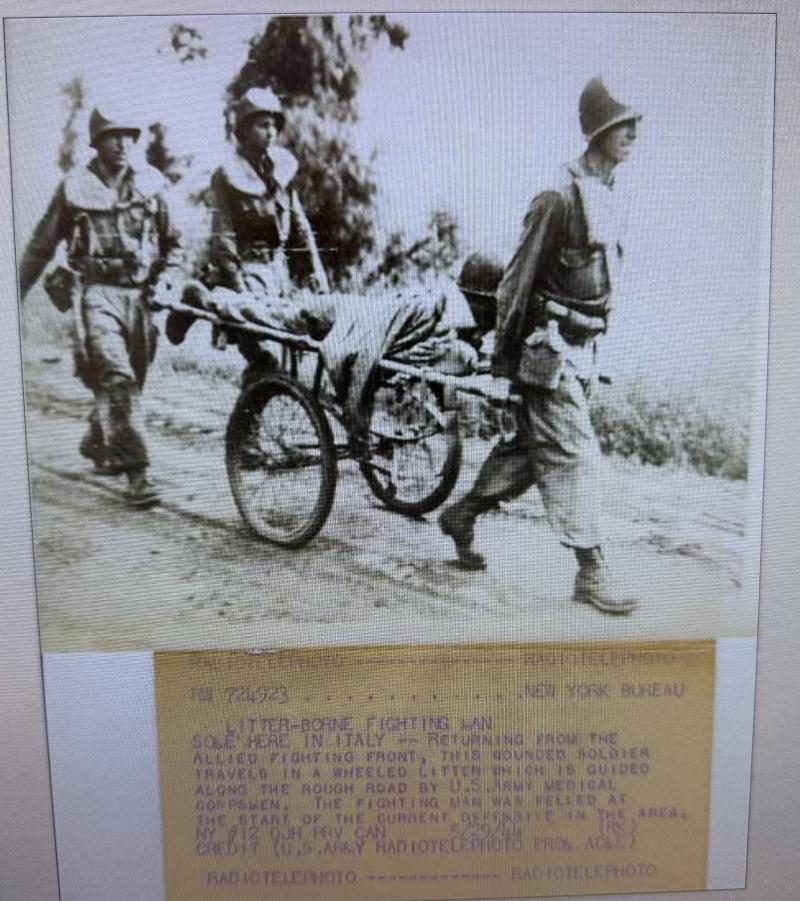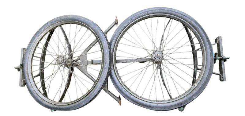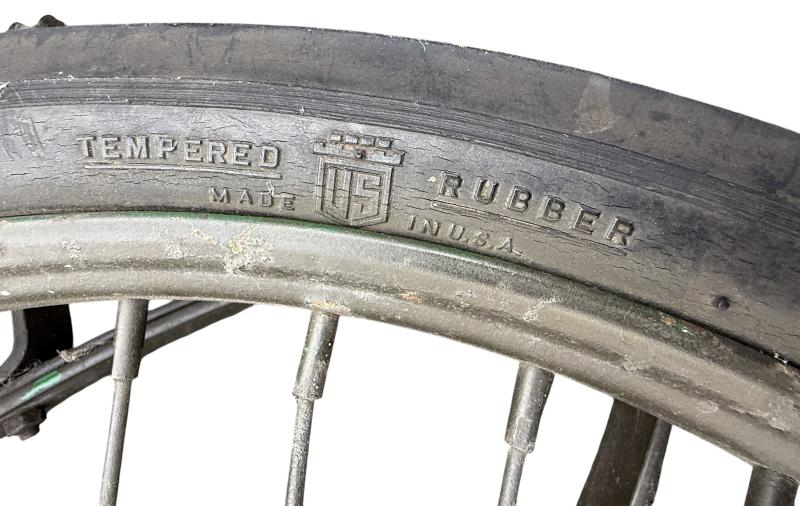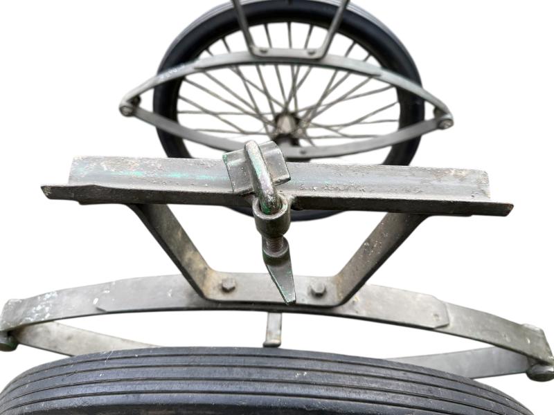 The carrier was designed as a collapsible 2-wheeled cart for carrying one loaded litter (stretcher) over long distances. Fitted with two wheels and a weight of around 59 pounds i.e. near 27kg. Although no visible makers marke these carts were only produced by a few manufactorers such as Best Metal Products, Inc., Long Island City, New York, Dayton Wheel Co, Dayton, Ohio, and the Jerald Sulky Co., Waterloo, Iowa. These carriers would have been used in both field hospitals as closer to the frontline within the European theatre of operations. The carrier is in good working order and nice used overpainted condition.and comes with the orginal 26 X2.125 U.S.Sniper Tyres