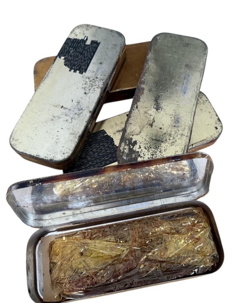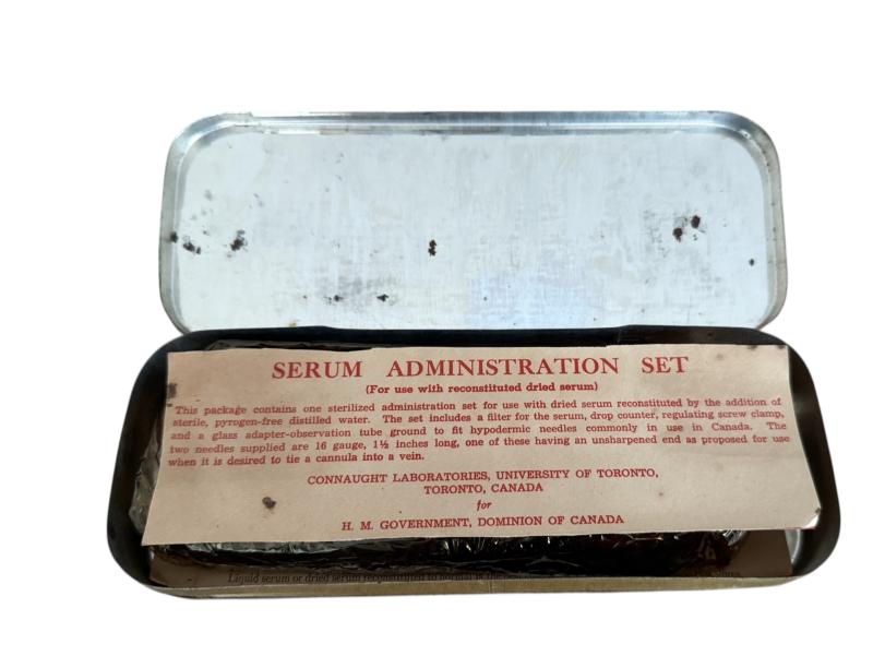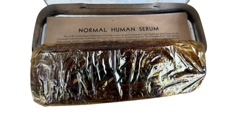These genuine metal tins contains a dried plasma serum dispensing set as used by Royal Army Medical Corps (RAMC) personnel for administering blood transfusions to wounded soldiers during the Second World War.