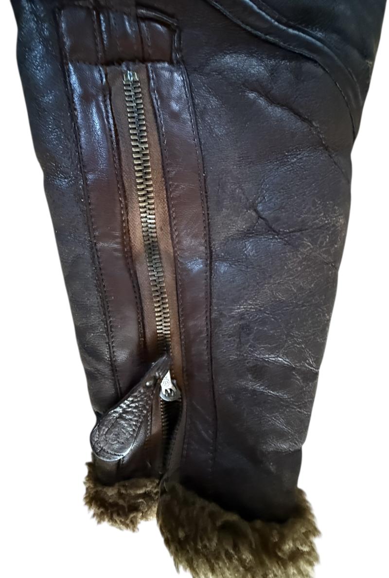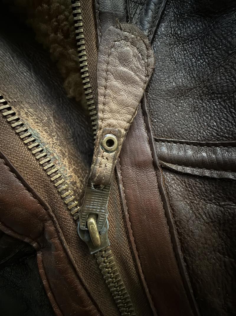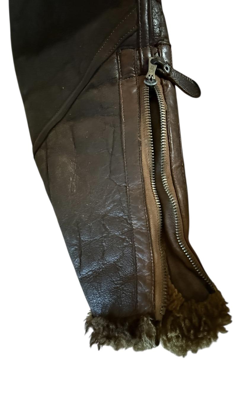 The jacket is fitted with original label and marked a size 4 (waist 32-34, height 5.8-5.9, breast 36-38). The label is marked with a Broad Arrow. The full lenght zip in working order and makers marked "Lightning", the smaller zippers on the arm are also in working order and compromise Air Ministry marked examples, marked with Kings Crown. The original leather waistband is also still present with the jacket. A highly attractive and wearable British Royal Air Force Irvin Flying Jacket.