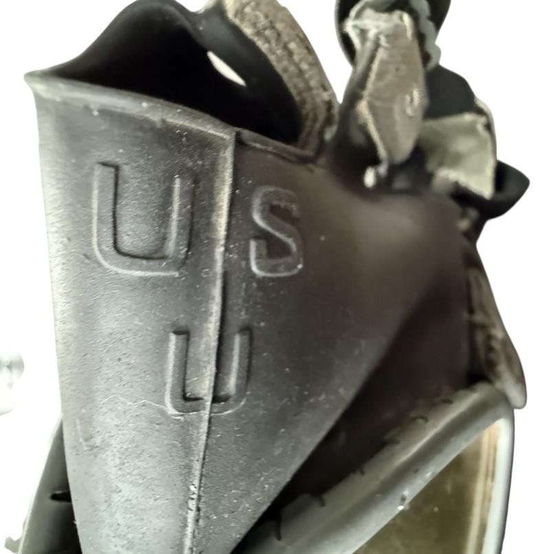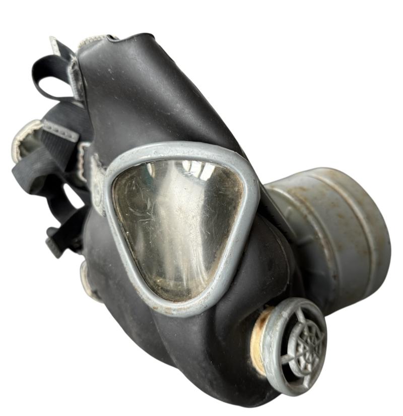 U.S. M5 assualt gas mask. Produced between February and August 1944. Clearly marked U.S. on front of the mask. The filter compromises an E3 Canister (British Light-type Containers were also authorized in case of short supply), makers marked 'CROWN' . This type of gasmask are very hard to find these days. With the M5 gasmask an original M7 carrier. Executed in rubber and still clear markings "Army Assualt Gas Mask" on the front. These assuault gasmask would have been used by assualt troops landing on the beaches of Normandy during D-Day. In overall nice used condition and great patina. Very hard to find these days!