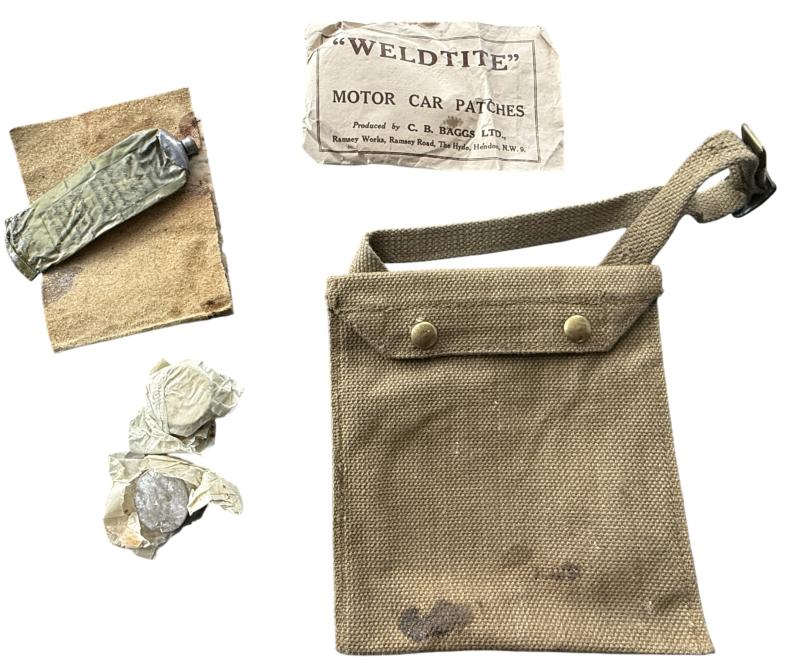 The kit consists of a 1944 dated and M.W.S. dated webbing wallet and carrying sling. The contents include "Weldtite", sandpaper and rubber solution. Some minor staining on the webbing. In overall nice used condition, increasingly hard to find these days.