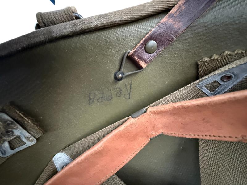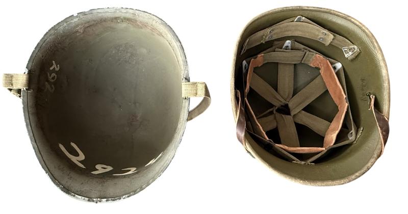 A textbook example of a front seam and fixed bale M1 helmet. The helmet is fitted with a so-called "Hawley" liner. This type of liners were produced by the Hawley Products Company and compromise the the first contract in 1941. The first contract was for 950.000 liners only. After this production was discontinued as the liners were not strong enough. The liner is in excellent condition with nice wear and age. Complete with leather sweatband and leather chinstrap. An attractive and nice used U.S. M1 Helmet Fitted With Hawley Liner.
