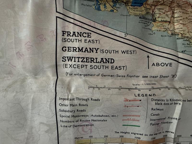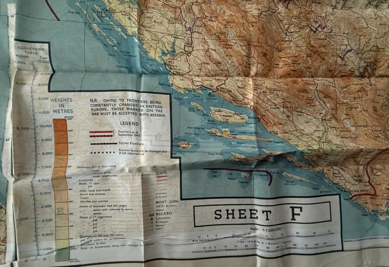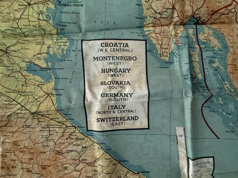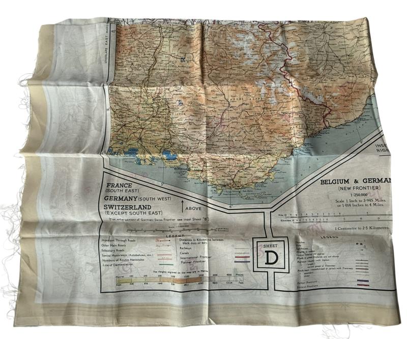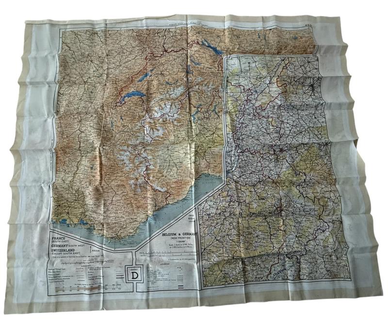 A nice used example of a British silk escape map. Compromising map D (Belgium & Germany) and F (Croatia, South Germany, Italy/Switzerland). These maps were British made but would also have been used by USAAF, RAF and SOE troops. With the silk map its original waterproof wallet, often displaced. A full original and nice used British Silk Escape Map And Escape Map Wallet.