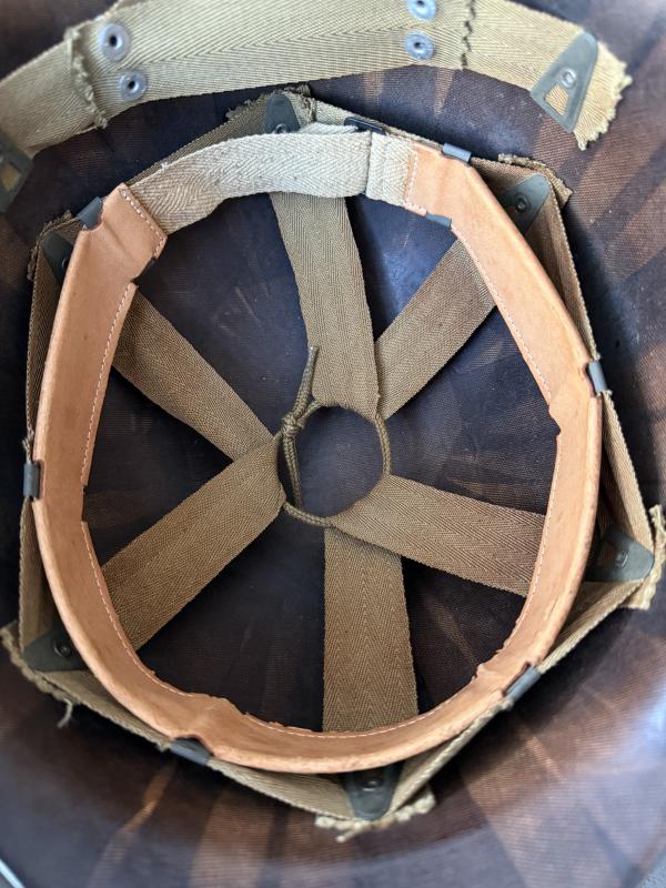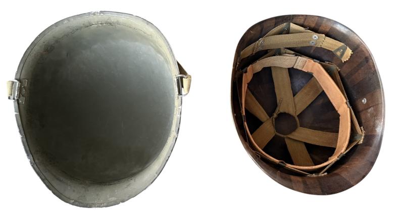 U.S. M1 Combat helmet. A textbook example compromising a so-called front seam and swivel bale example. The helmet is fitted with canvas chinstrap and shows clear use adding to the patina of the helmet. Fitted with original M1 liner, the liner is clearly makers marked Firestone. The leather sweatband and suspension are still present yet also shows clearAn attractive U.S. M1 Combat helmet with Firestone liner.