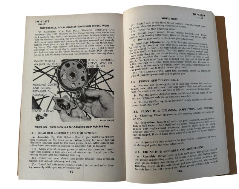 TM 9-1879 Technical Manual for Harley-Davidson Model WLA. Published by the War Department in March 1944. This technical manual is in nice used condition Hard to upgrade.