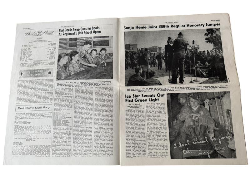 In excellent condition this August 7th 1945 edition of the Devils Digest Magazine. The magazine of the 508th Parachute Infantry Regiment. The last page depicting a tribute to St. Mere Eglise Troopers. The 508th Parachute Infantry Regiment participated in Operation Overlord, Market Garden and the Battle of the Bulge.