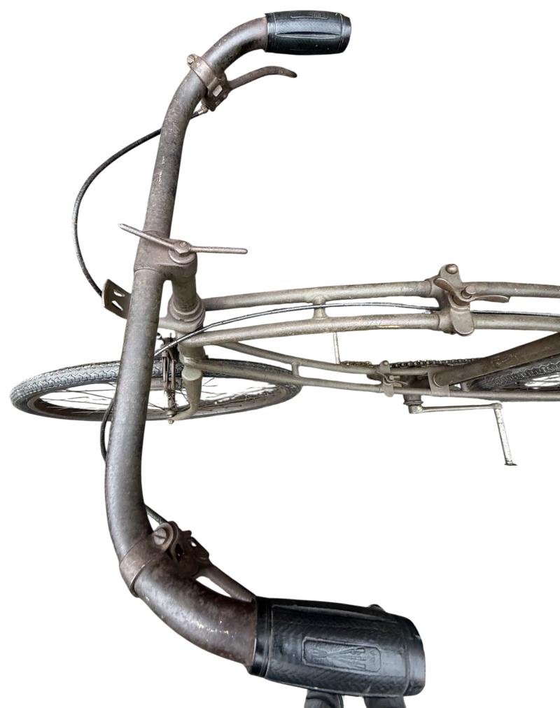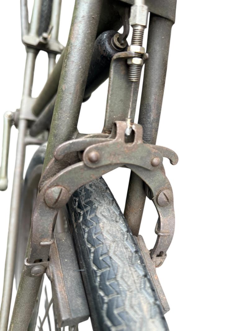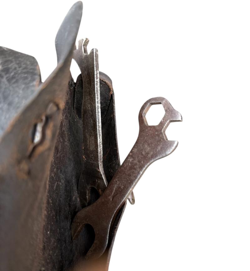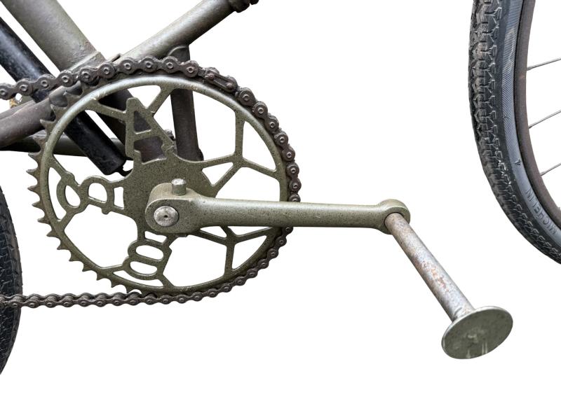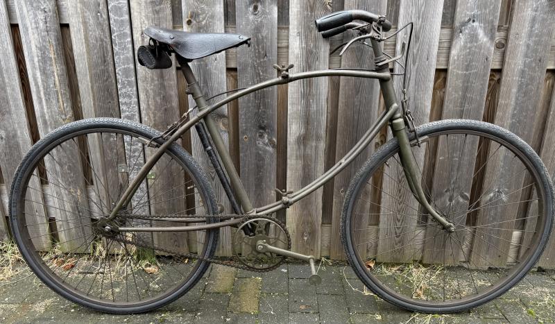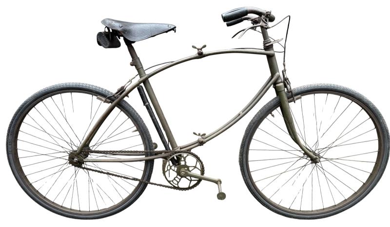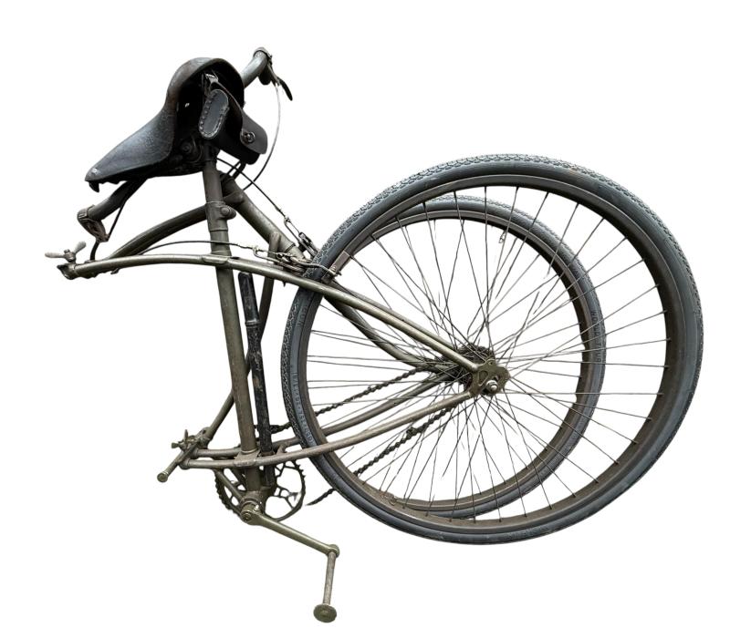 The BSA Folding Bicycle was designed for used by British Paratroopers and could even been carried by a Paratrooper in descend. This particular bike compromises the so-called 2nd pattern. Original wheels, hand brakes and BSA handgrips. The leather saddle is equally BSA makers marked. In clear nice used condition. Fitted with original leather toolkit complete with various tools. An atttractive British (Airborne) BSA Folding Bicycle as used during D-Day and the Battle of Arnhem. Can be upgraded.