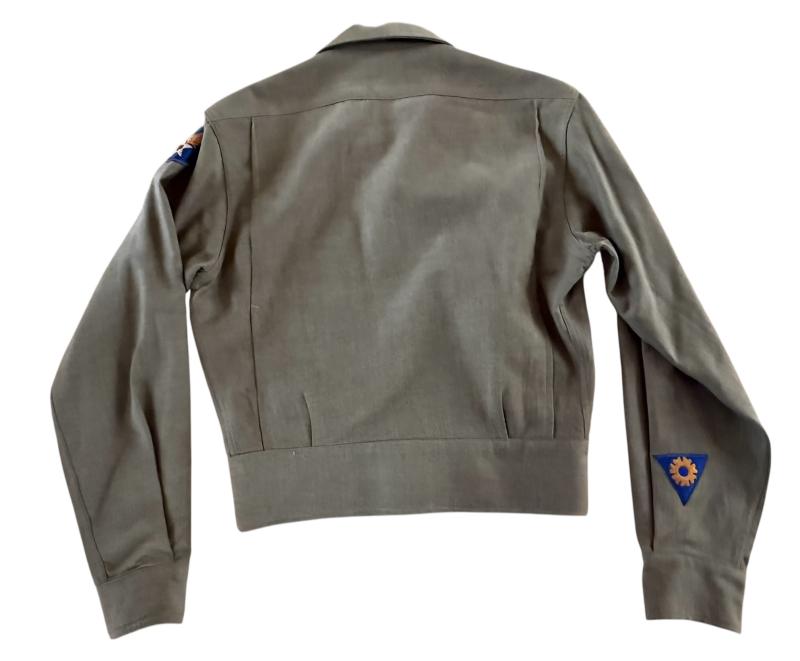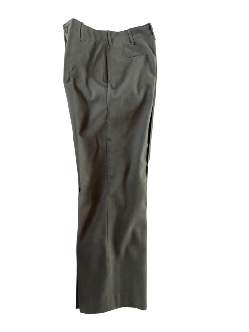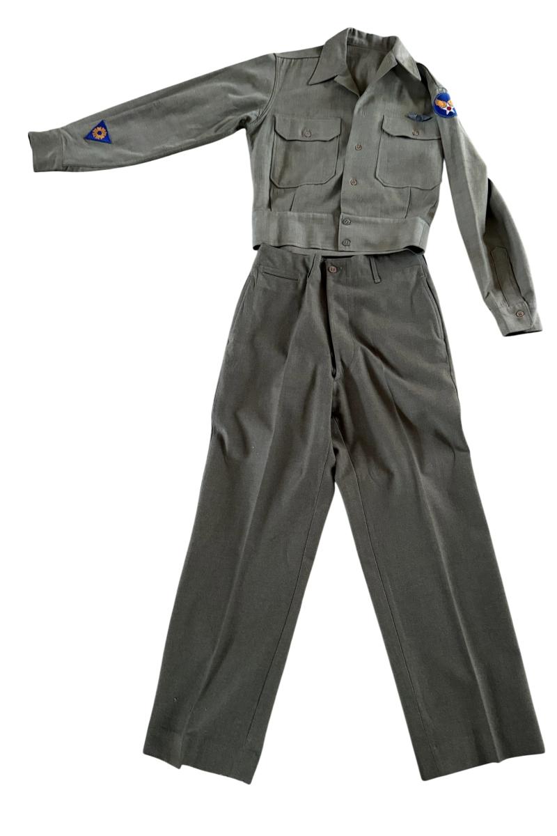 A rare and unusual item. This Enlisted mens flanel shirt is period taylored to the size and model of an IKE jacket. Fitted with Air Crew wing and U.S. Air Force formation patch. Laundry numbers being written in the interior of the shirt. Taylored to personal preference, possibly being stationed in a warm climate. With the shirt comes an original pair of trousers. The wool serge trousers are fitted with original yet washed out label. Sized waist 30 and inseam 31. A unique pair of taylored flanel shirt and wool serge trousers. Hard to be upgraded.