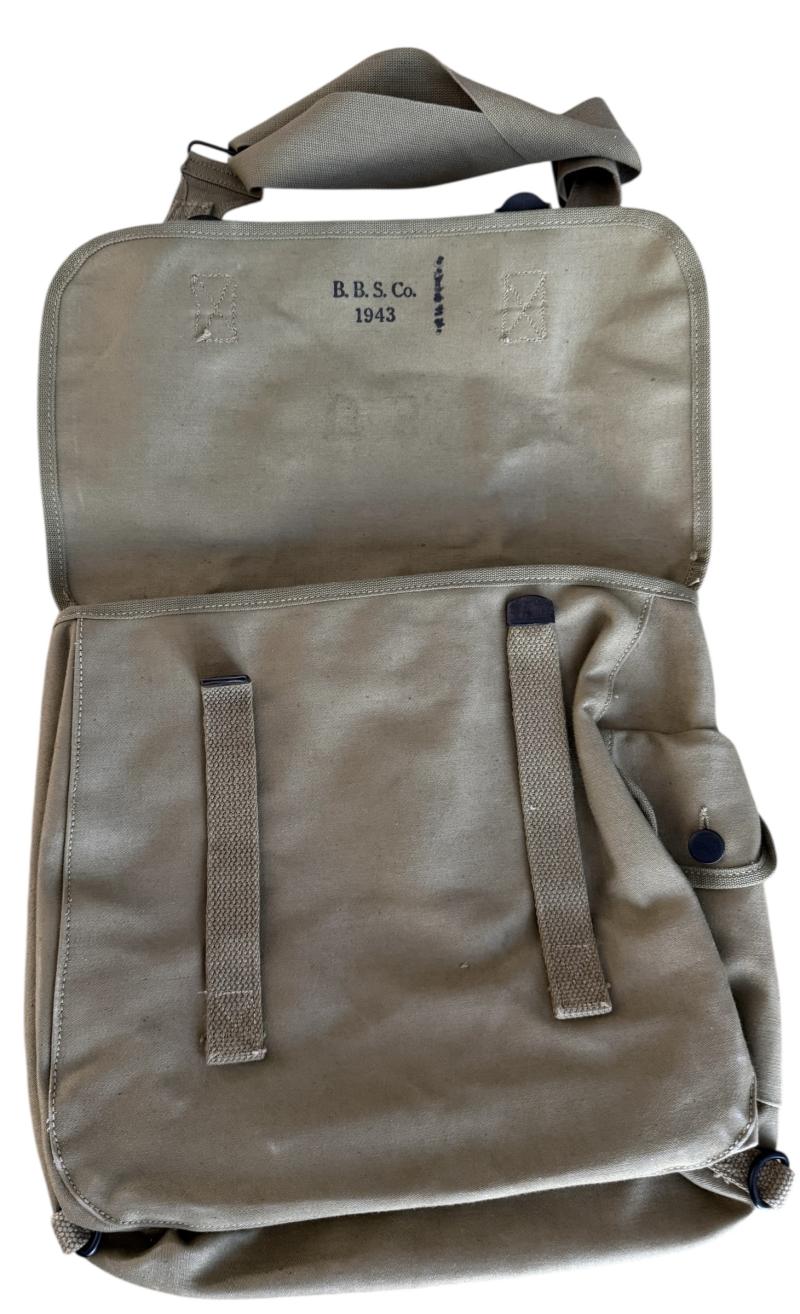U.S. M1936 Musset Bag. Executed in a waterproofed i.e. rubberized canvas. Clearly 1943 dated and makers marked "B.B.S. Co.". The musset bag is fitted with an original and 1943 carrying strap. Both bag and strap are in mint condition, and cannot be upgraded.