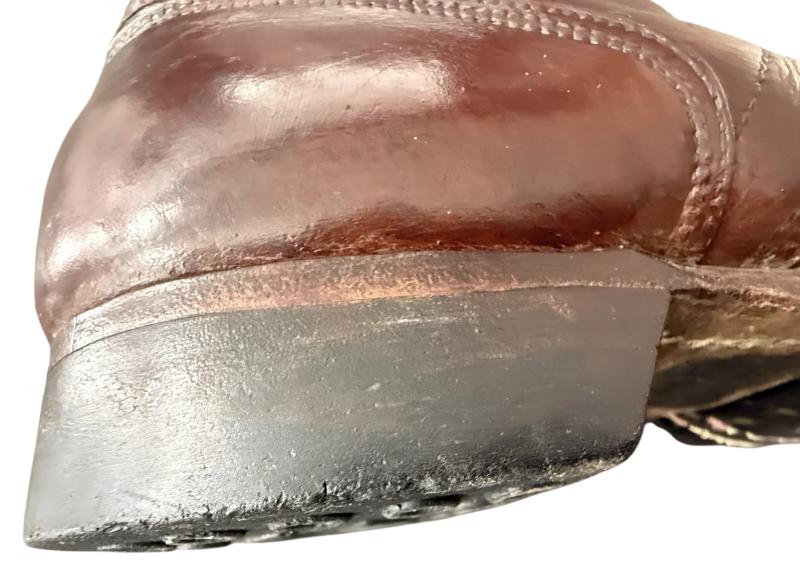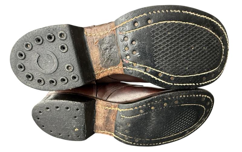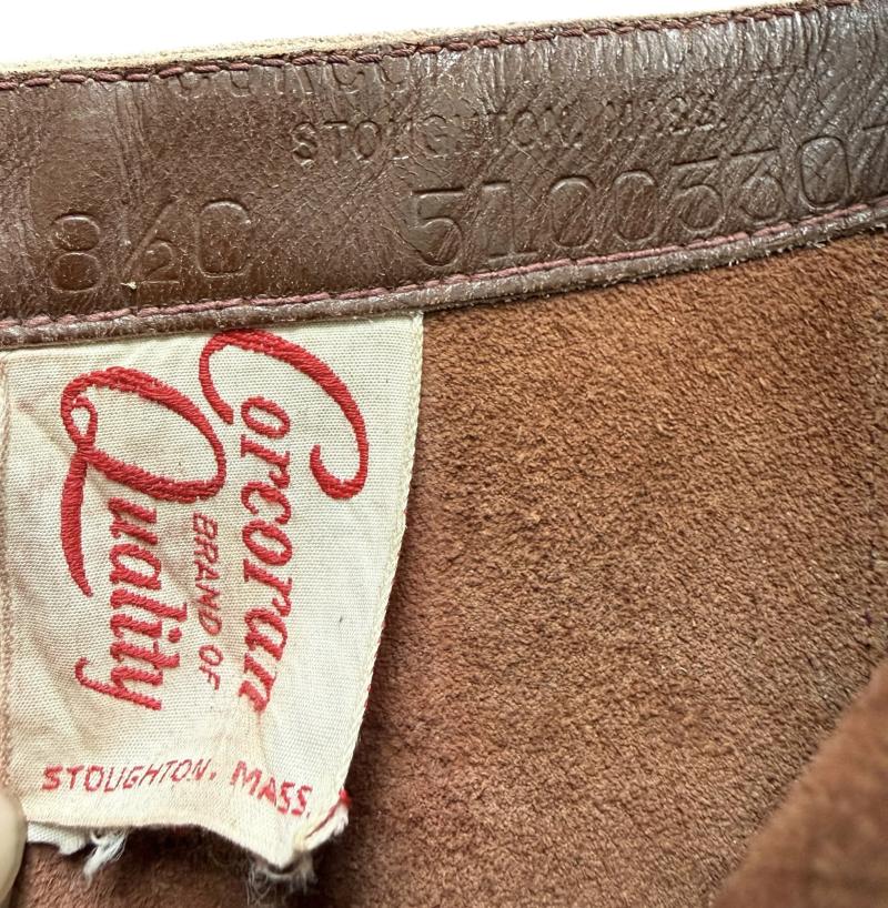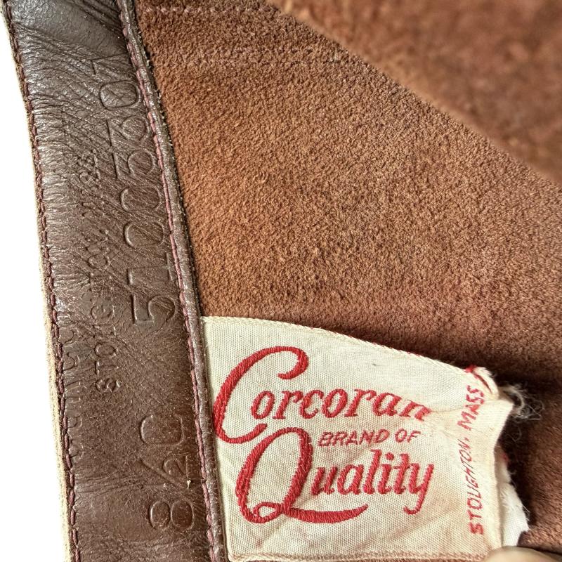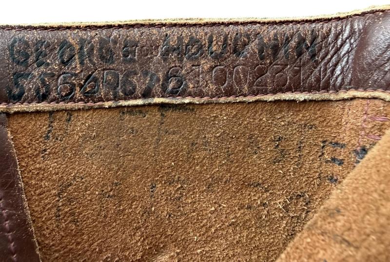Produced by one of the larger contractors for these iconic jump boots. This particular pair of boots is makers marked Corcoran, both stamped in the leather and fitted with original Corcoran label. The boots appear named "George Houghin 55609670 . Sized 8 1/2 C. The boots show good wear and age, however the leather remains in excellent and smooth condition. Increasingly hard to find Corcoran Boots in this condition.