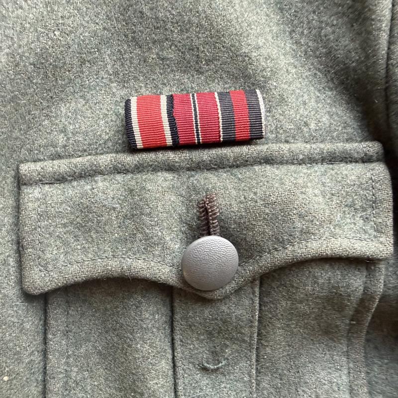 Wehrmacht (Heer) Officer's Tunic as intended for an 'Major der Artillerie'. This is a nice quality, 'privately purchased' M36-style field-grey wool tunic. The tunic is overall nice used condition and with a stunning patina! The tunic is complete with all insignia, including a hand-embroidered breast-eagle, shoulder boards and officer's type collar tabs. Both the collar tabs and shoulder-boards are piped in the red 'Truppenfarbe' indicating the Artillery. The shoulderboards are sewn in and indicate a Major der Artillerie. The tunic is fitted with ribbons for 2nd Class Iron Cross and Ostmedaille. The tunic a decent mannequin size. A highly attractive WH (Heer) Artillery Officer's Field Blouse.