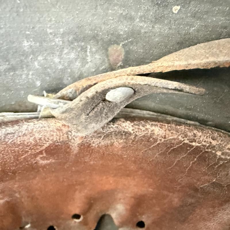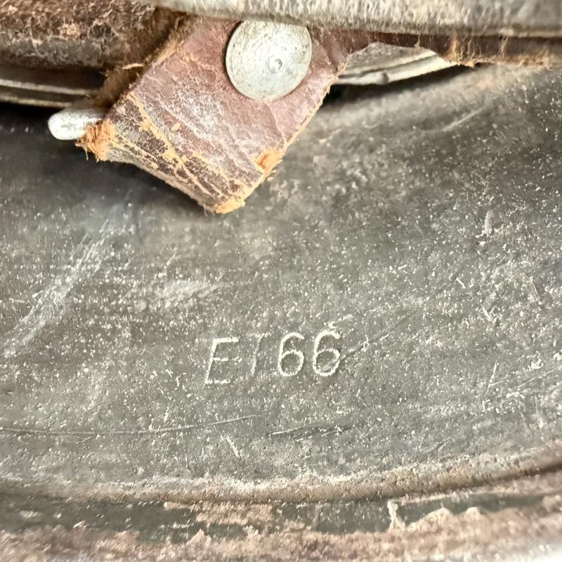 The helmet is market ET66 which indicates production by the company of Eisenhuttenwerk AG, Thale Harz and size 66. The helmet is marked with serial number 3960 in the neckguard. The original leather liner is present and equal nice used condition with all seven extended fingers being present. The helmet is fitted with original brown leather chinstrap makers marked Carltesch Berlin and 1937 dated. An nice used WH (HEER) M35 Single Decal Combat Helmet that can be upgraded.