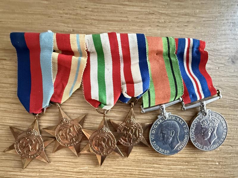 Medaille set; 39-45 star, Africa star, italy star, france & germany star, war and defence medal. Named cardboard medalbox.