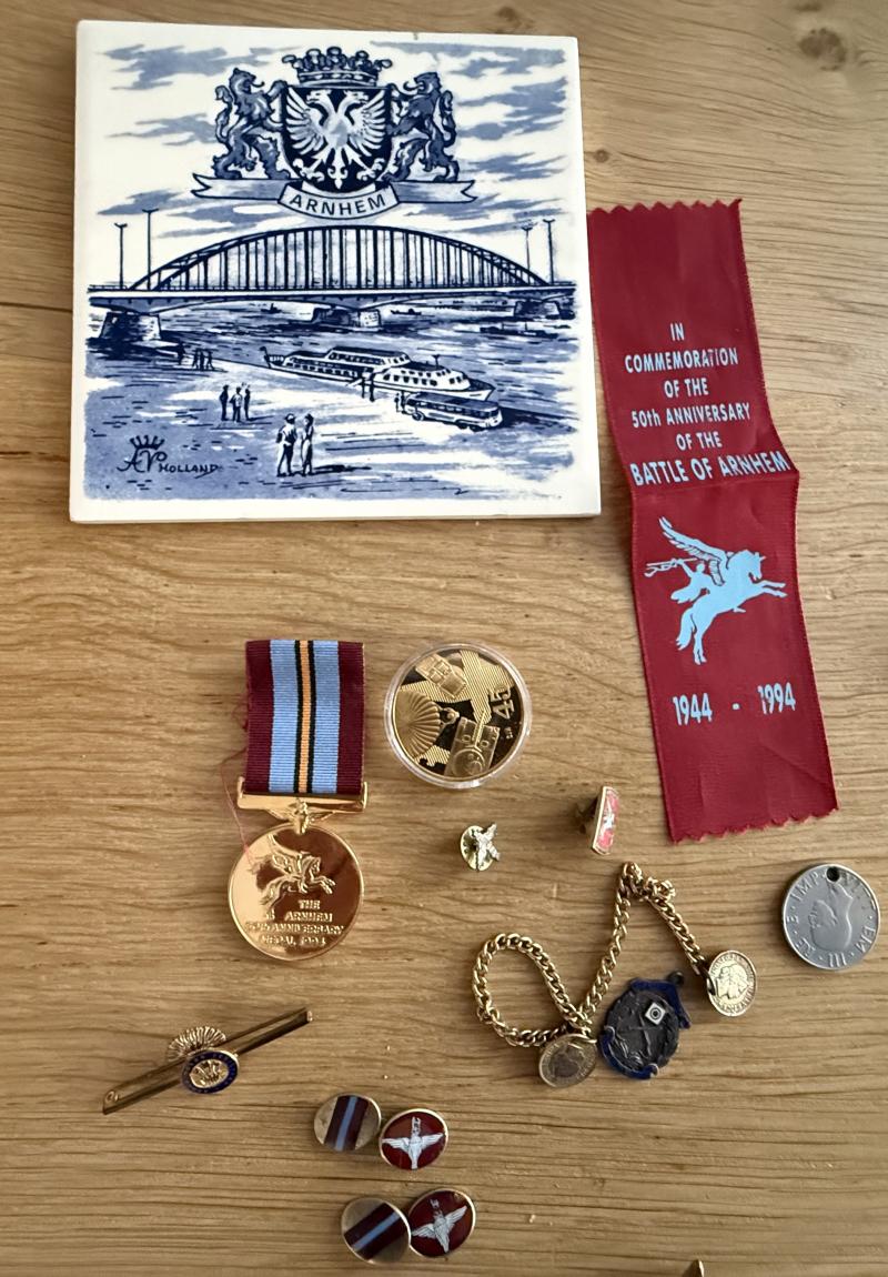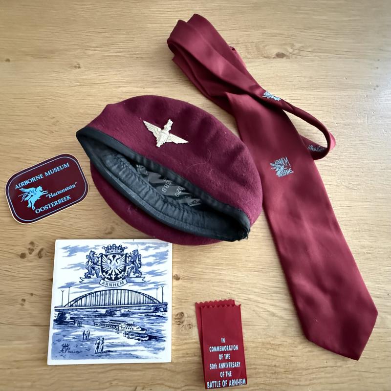 Various Arnhem souvenirs such as Irvin pins, Arnhem 50th Anniversary (1994) medal and his post war red beret and tie that he would have worn during the commemorations.
