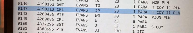 Named to Corporal Evans, 4198313 1st Parachute Battalion T Company 11 platoon. Made POW at Arnhem.