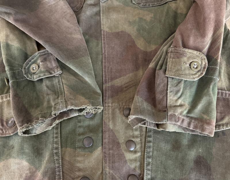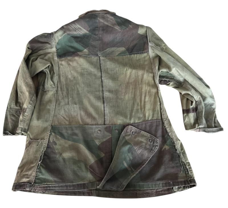 British (Airborne) Denison Smock, compromising the so-called 2nd model. This denison smock is in nice used condition with trace of wear and an attractive deep camouflage shade. with missing label, compromising a size 4 or 5 and and Broad Arrow marked. L 1945/1946 The smock is fitted with a full working zip and "Newey" press studs.(one press stud is missing) A stunning nice used British (Airborne) 2nd Model Denison Smock hard to be upgraded.