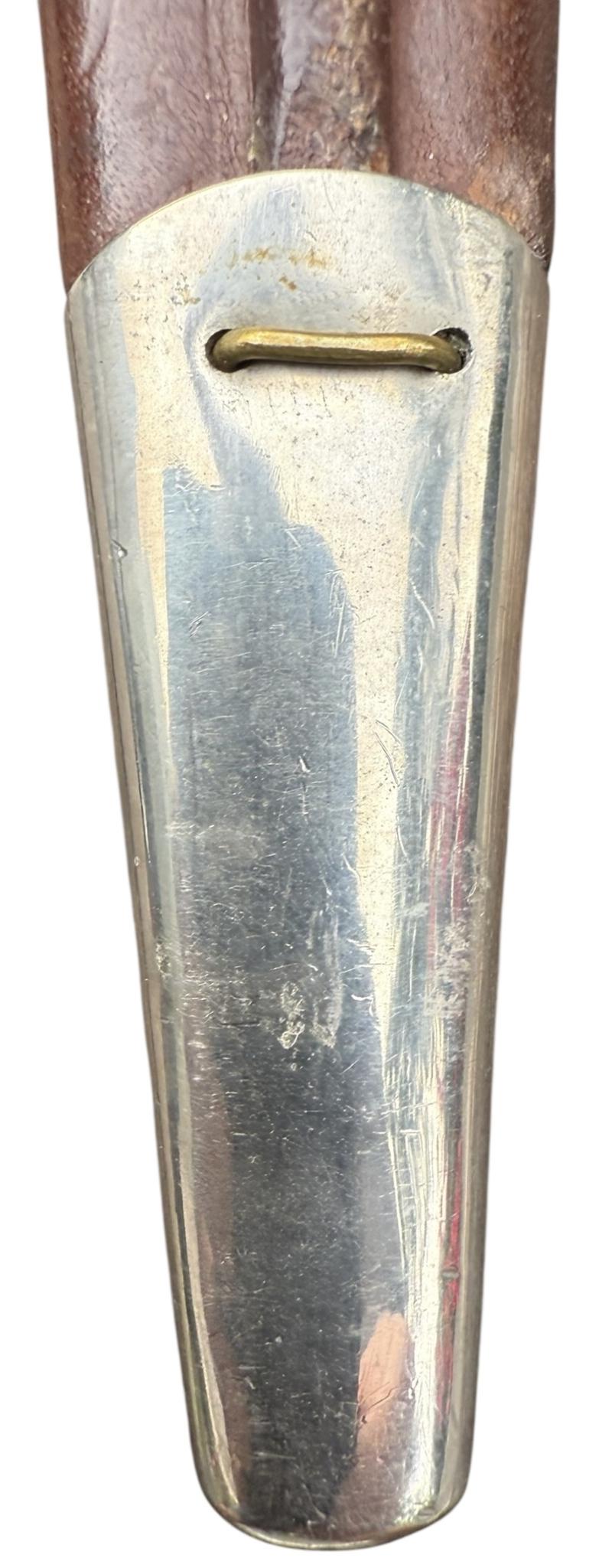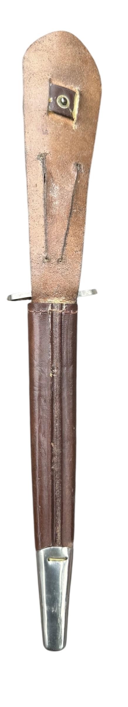 The leather scabbard is like the knife in nice used condition. The scabbard does not have any leather sewing tabs which was common especially with the early produced First pattern knives. An highly sought after pattern Fairbairn Sykes with a great patina that would be hard to upgrade!