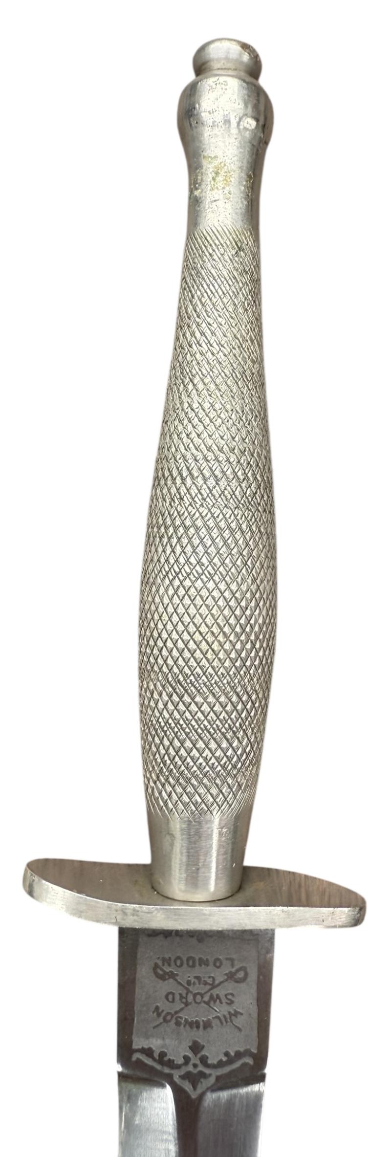A very rare and textbook example of a British Airborne and/or Commando First Pattern Fairbairn–Sykes Fighting Knife.made by Wilkinson Sword The knife is executed with the Slim, double-edged blade and brass handle with deep grooves. Makers marked Wilkinson Sword.