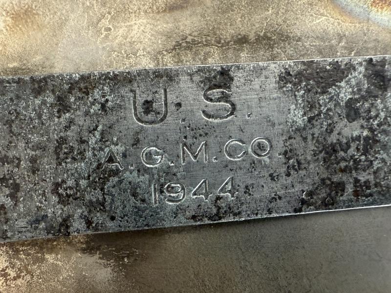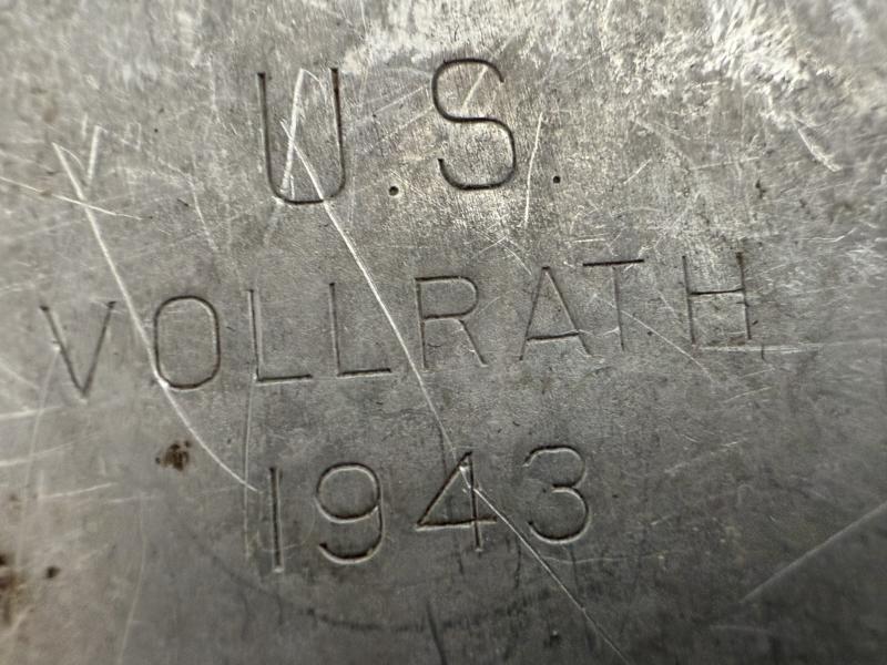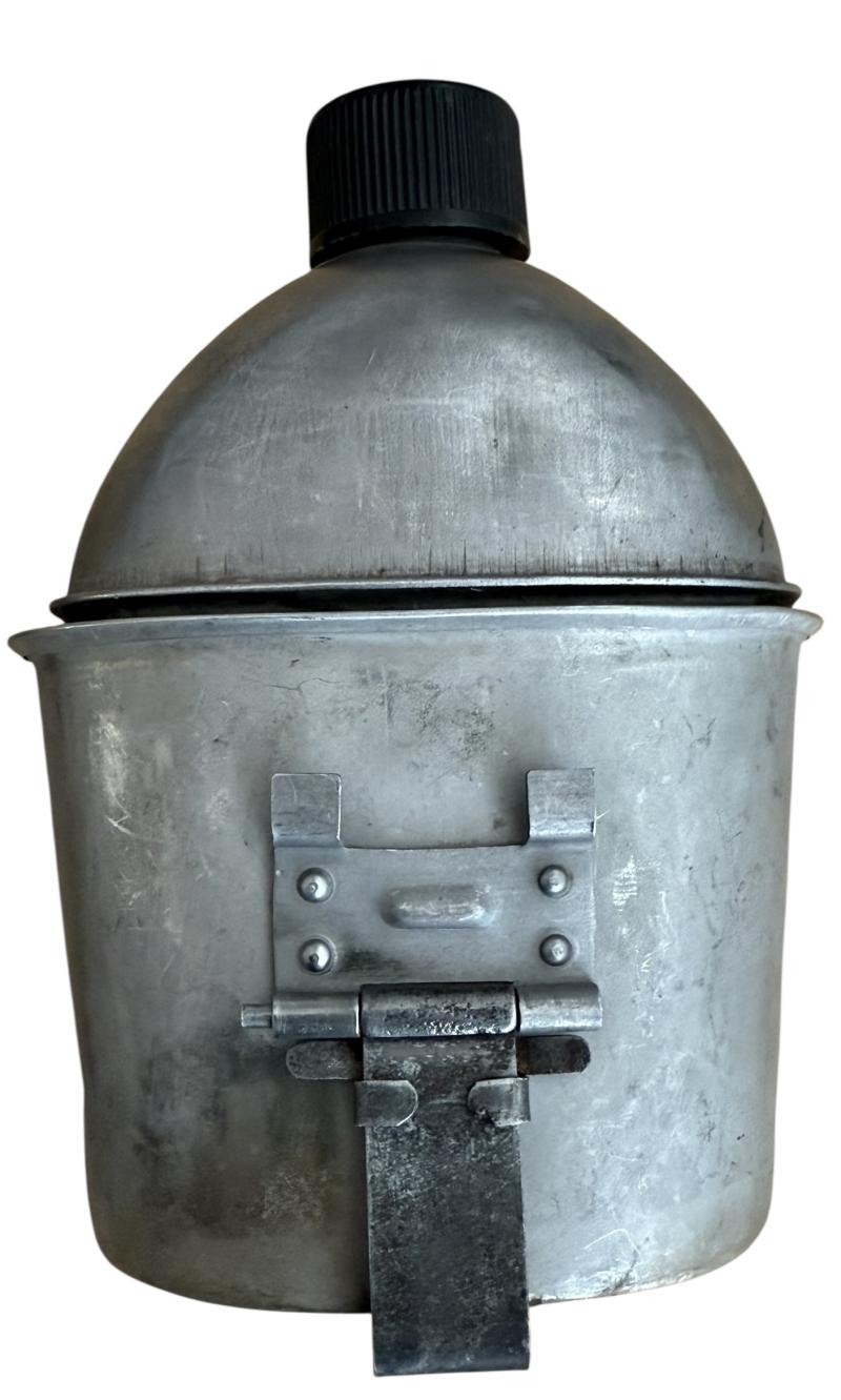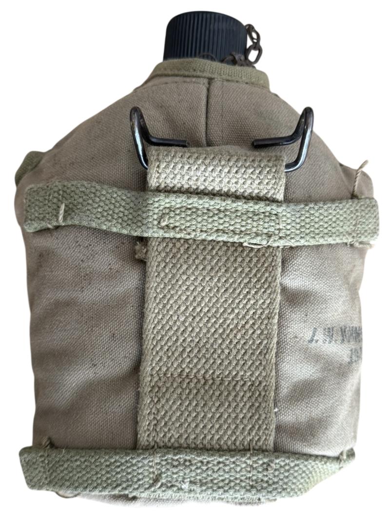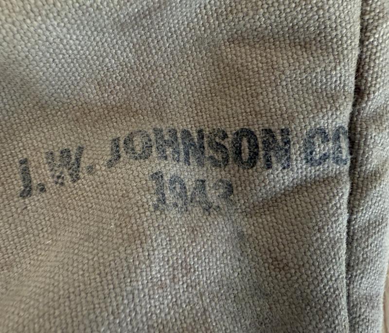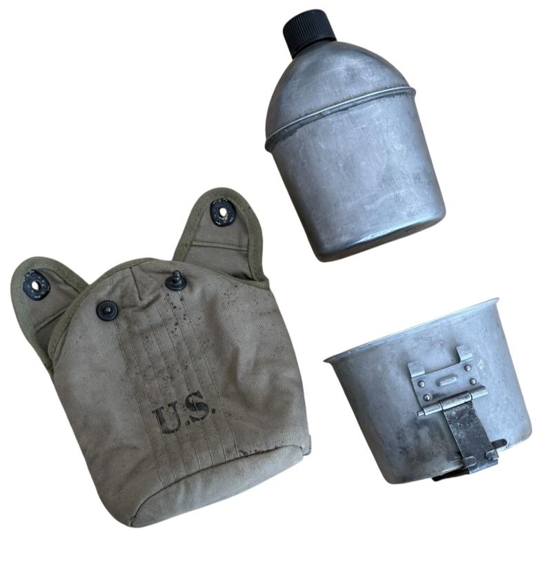 U.S. M-1941 Mounted Canteen Cover, initially developed for horsed troops these were soon favoured by U.S. Airborne troops. The cover is in nice used condition, makers marked J.W. Johnson and 1943 dated. With original canteen and cup. The cup being 1944 dated and the canteen dated 1943. In nice used condition.