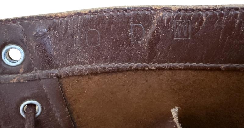 Produced by one of the larger contractors for these iconic jump boots. This particular pair of boots is makers marked Corcoran. Both stamped "Corcoran Stoughton" in the leather liner of the boots. Fitted with original "Goodyear" soles in equal nice used condition. The boots compromise a large size 10 D.