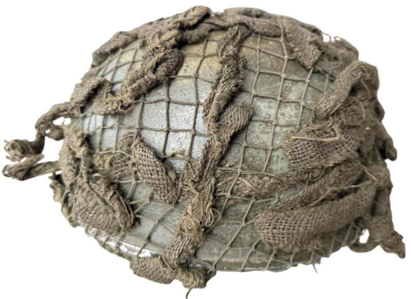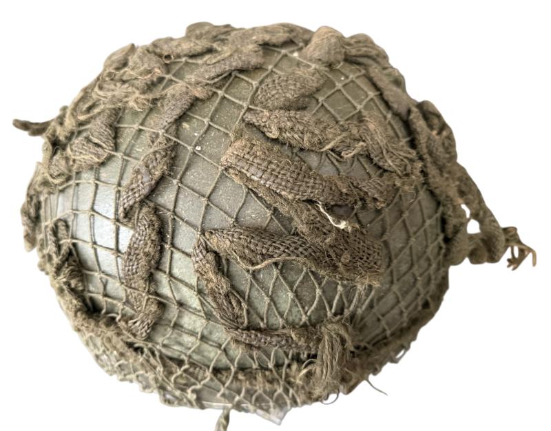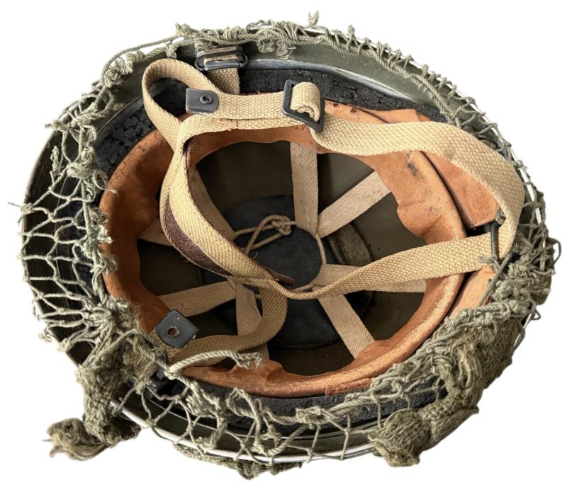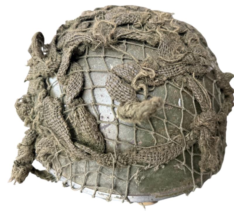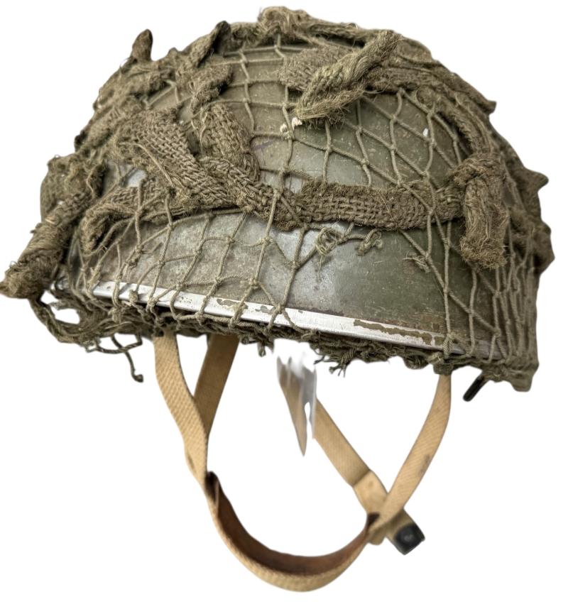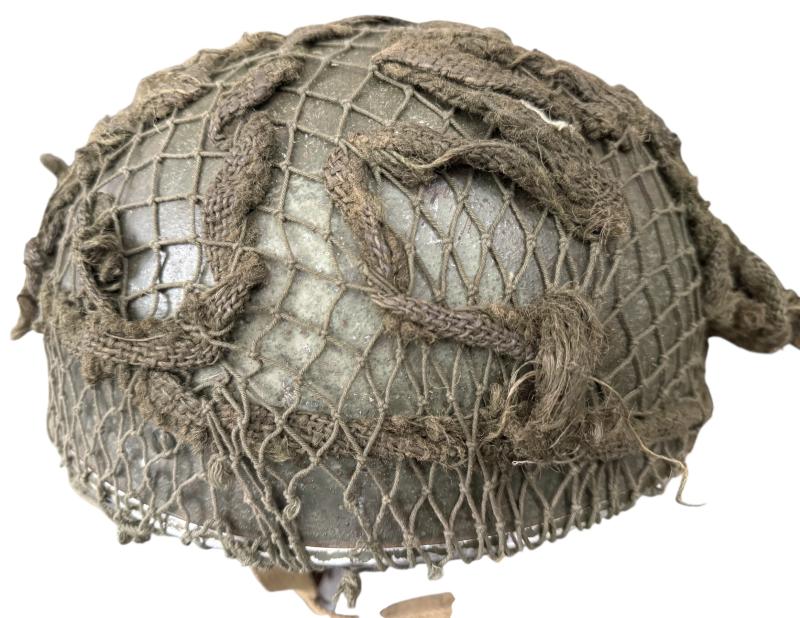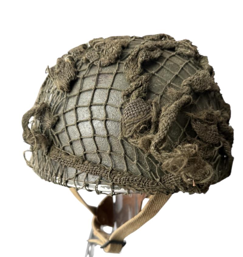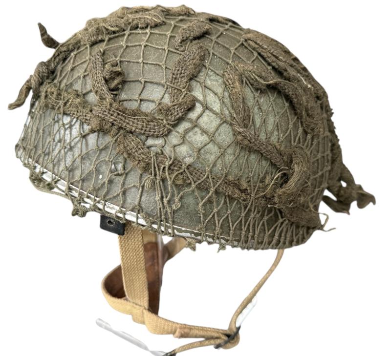 A well-preserved British (Airborne) MK3 Paratrooper Combat Helmet, showing signs of use and age that contribute to its appealing patina. It comes complete with clearly maker marked liner by BMB (Briggs Motor Bodies), dated 1943 and sized 7 5/8. The sorbo padding remains in good condition, and the helmet is fitted with original webbing chinstraps and orginal period camouflaged helmet netting.with jute straps The shell has been repainted once probably at the time Overall, this is an attractive MK3 Airborne helmet in nice used codition.