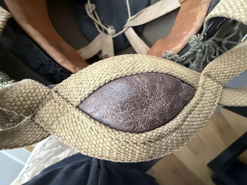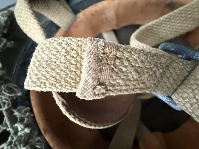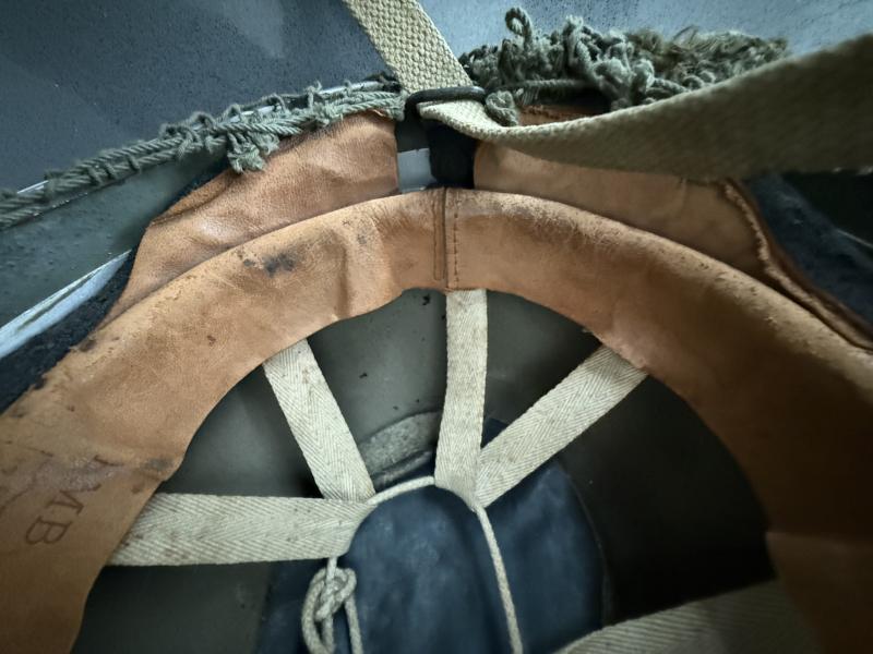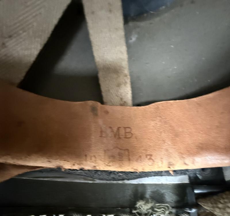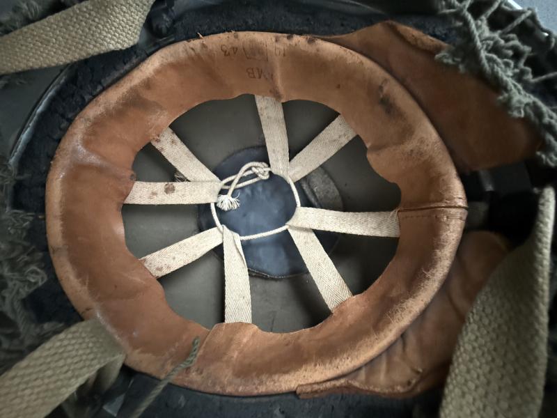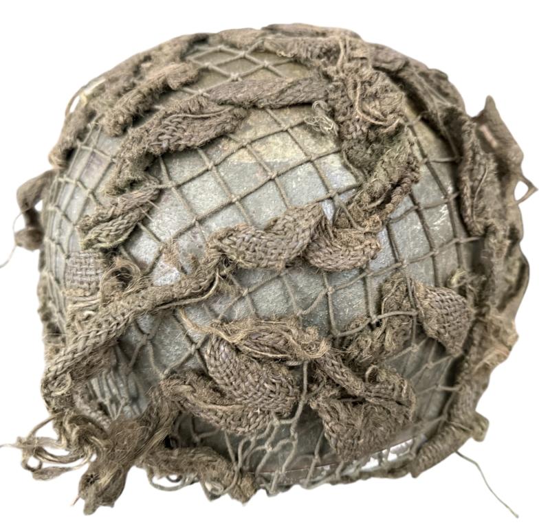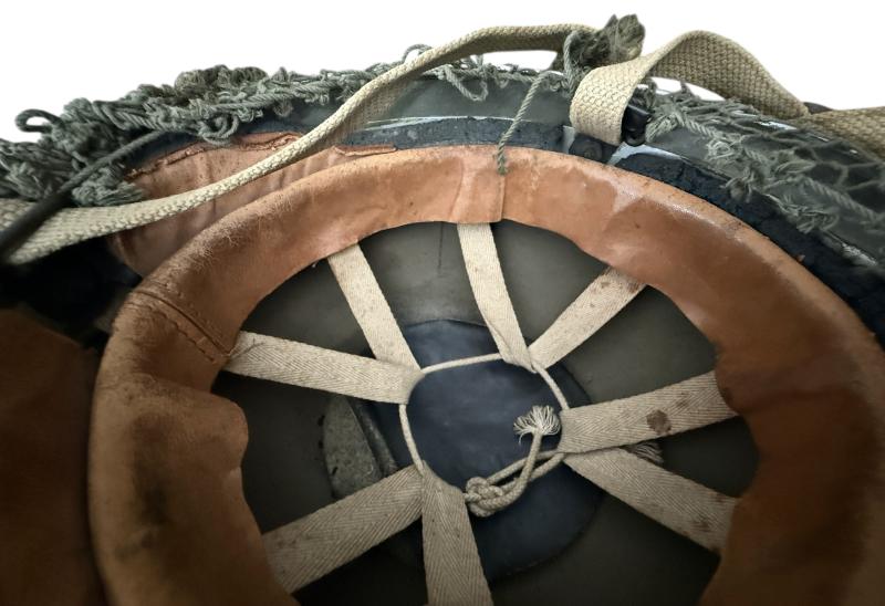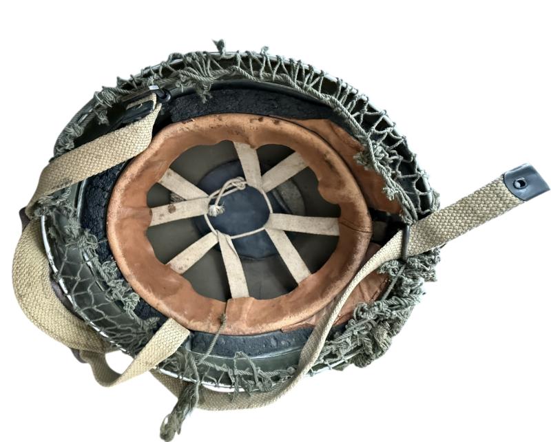 A well-preserved British (Airborne) MK3 Paratrooper Combat Helmet, showing signs of use and age that contribute to its appealing patina. It comes complete with clearly maker marked liner by BMB (Briggs Motor Bodies), dated 1943 and sized 7 5/8. The sorbo padding remains in good condition, and the helmet is fitted with original webbing chinstraps and orginal period camouflaged helmet netting.with jute straps The shell has been repainted once probably at the time Overall, this is an attractive MK3 Airborne helmet in nice used codition.