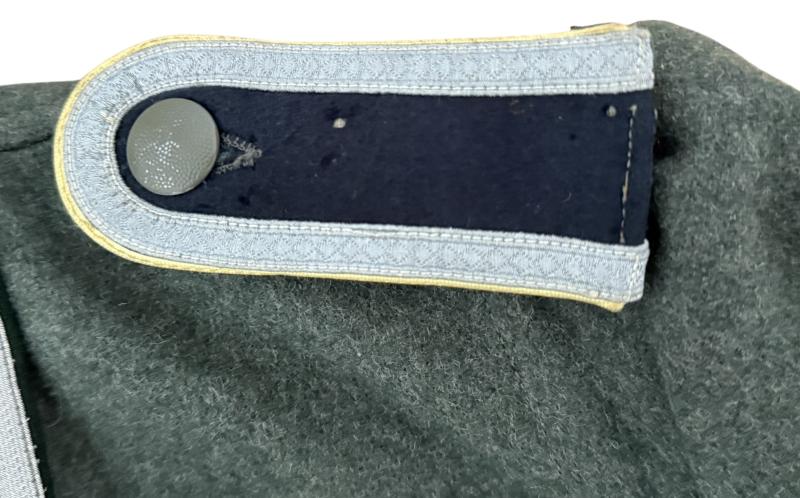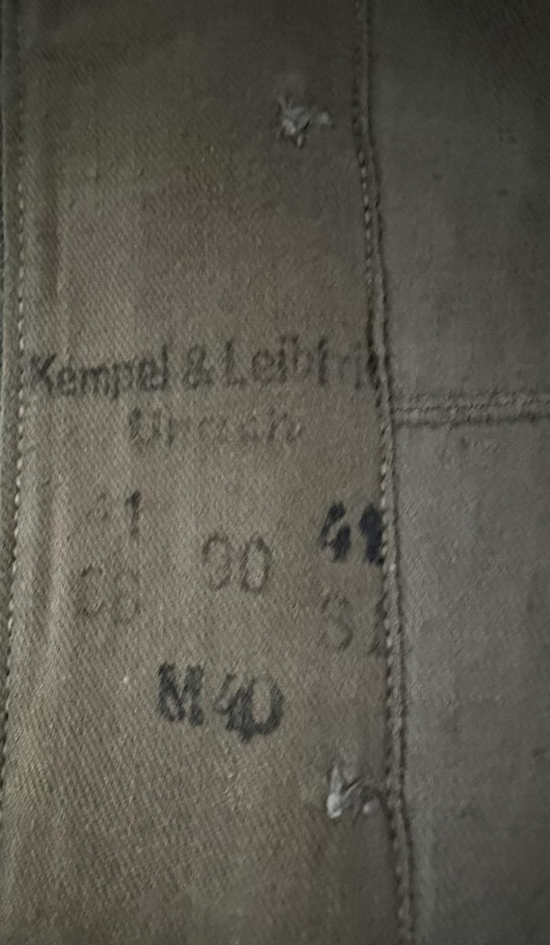 WH (HEER) M36 Cavalry NCO's “Spiess” Field Blouse. Executed in high quality wool/rayon and with five front closure buttons and the textbook four, pleated, front pockets. The tunic is original applied with NCO type breast eagle, cavalry collar tabs and shoulderboards. The collar-tabs and shoulderboards are have yellow piping as intended for Cavalry (Kavallerie) personnel. The jacket also has original ‘Der Spiess’ (Senior NCO) stripes attached on each cuff.The interior of the field blouse is partially lined in ribbed, grey/tan cotton, there is a small bandage pocket on the lower right. The field blouse is nicely size marked (chest size 90cms) and nicely maker marked "Kempel & Leibfried" from Urach, the tunic bears a 1940 depot marking (M40). The jacket shows only some minor wear and is in nice condition.