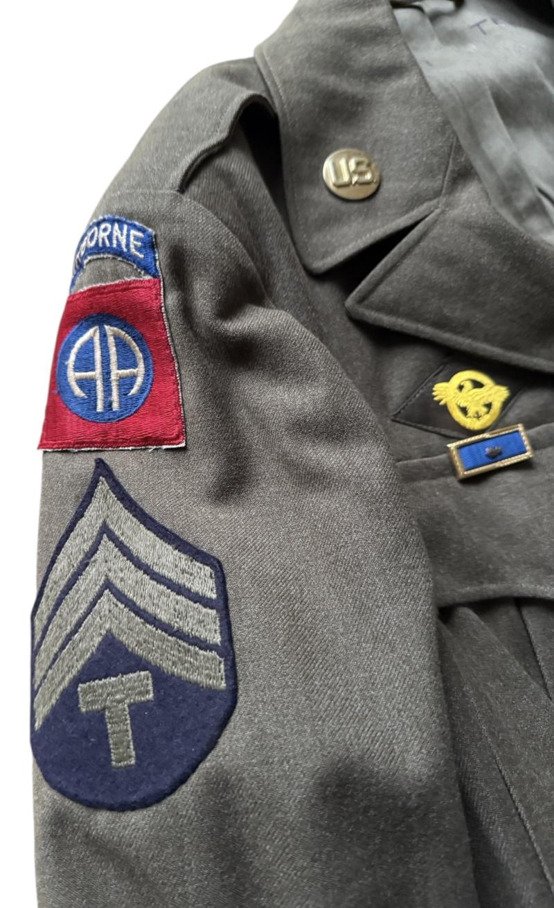 This is a stunning and historical U.S. (Airborne) 82nd Airborne Grouping. Recently purchased out of the woodwork. The grouping consists of an IKE uniform i.e. jacket, trousers and side cap.