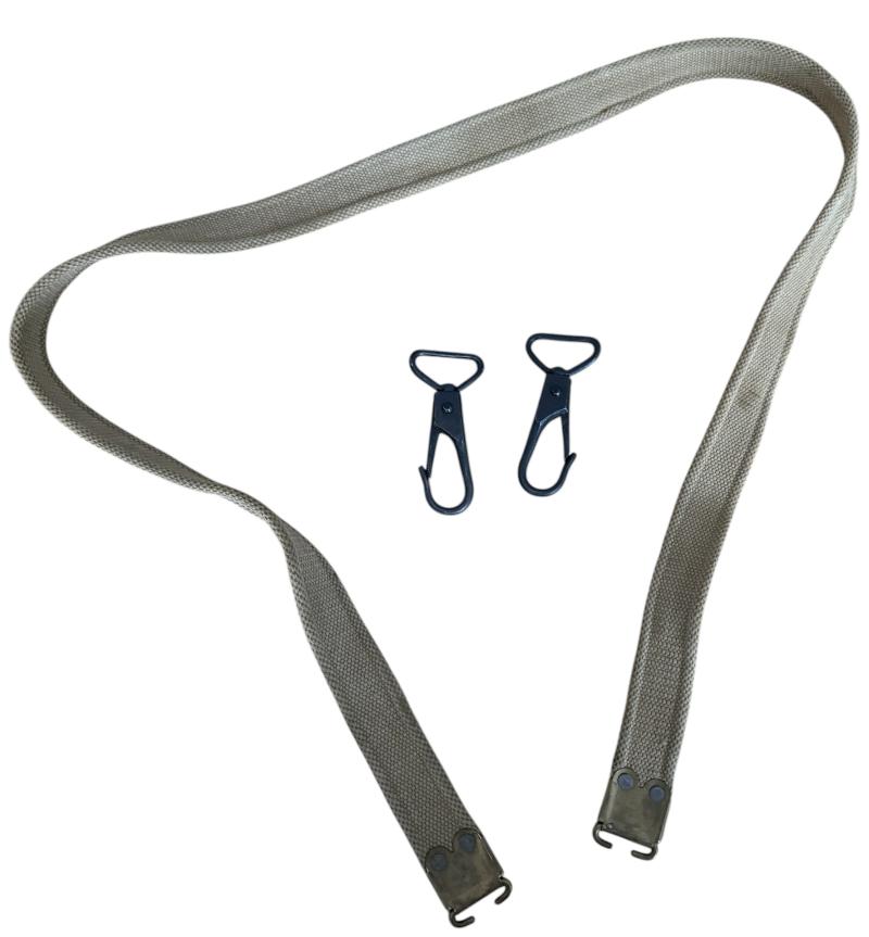 A nice used example of a British carrying sling for the Bren Gun. Executed in webbing canvas and fitted with two larger snap hooks. The sling is not visible makers marked or dated.
