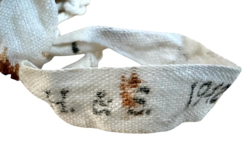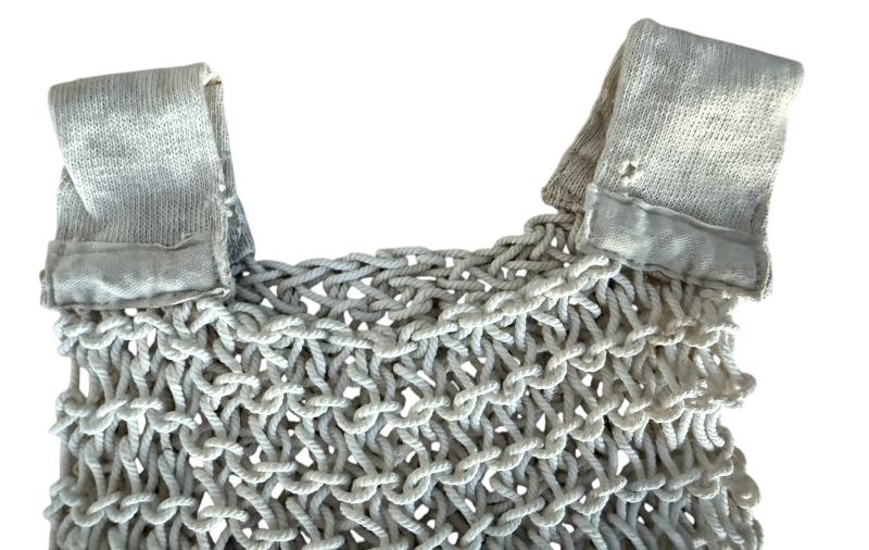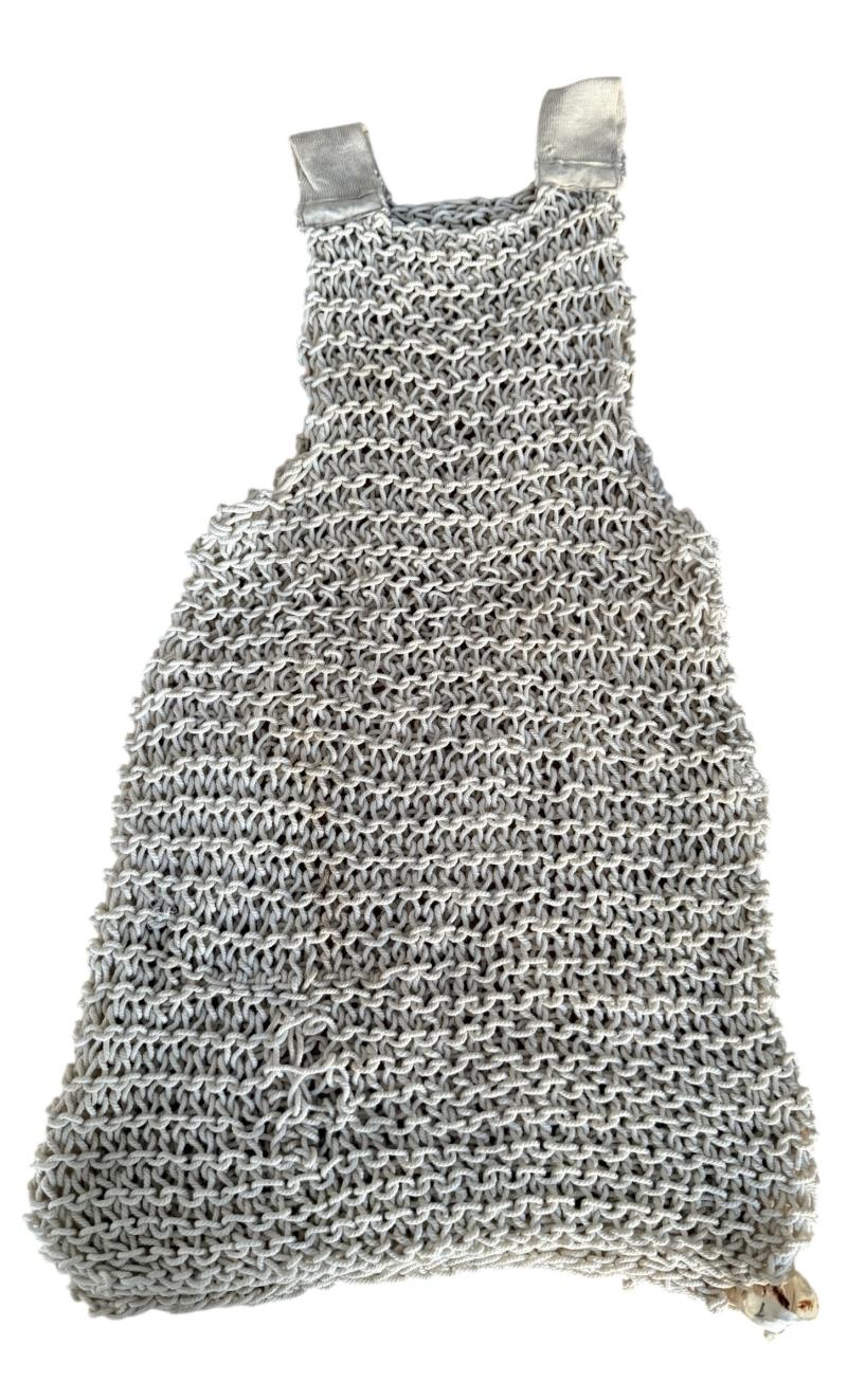 This is an original British cotton string vest dating from the early 1940s, commonly referred to as an “Escape string vest.” The vest could be unraveled and plaited into a rope to aid escape if required. Such garments were issued to paratroopers, pilots, and commando troops, valued for their lightweight construction and dual-purpose utility.