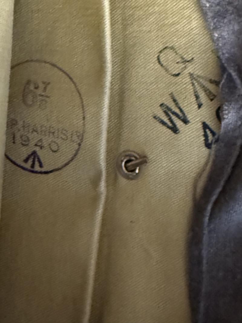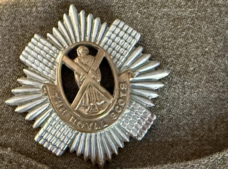 A British Side Cap original mounted with Royal Scotts cap badge. The side cap is in overall nice i.e. light used condition. Makers marked S&P Harris in the liner and sized 6 7/8. The cap compromises a rare early war i.e. 1940 dated example. As well as clearly Broad Arrow and War Department stamped. The Royal Scotts took part in the Battle of the Scheldt as part of the First Canadian Army, and the advance to the Rhine; it crossed the Rhine in March 1945 and advanced to Bremen by the end of the war. A very nice early war and original mounted British Side Cap.