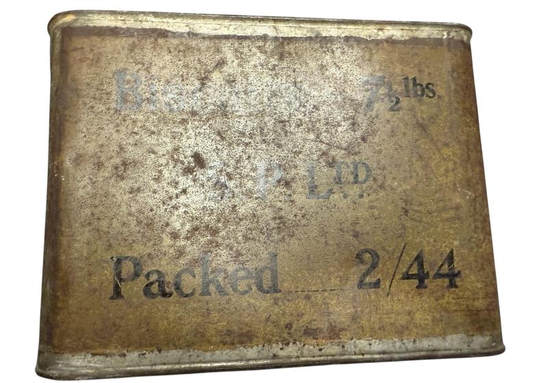 British Biscuits Ration Tin. Clearly makers marked S.P. Ltd and dated February 1944. The tin would contain 7 1/2 Lbs of biscuits. The tin is empty. Complete with original lid. In nice used condition.