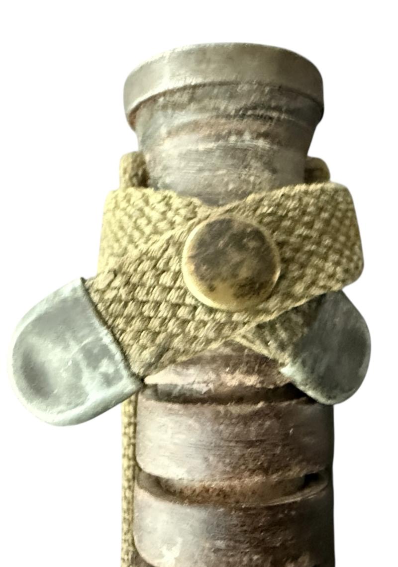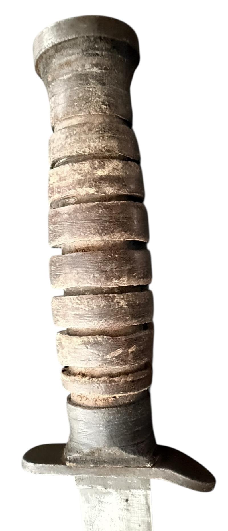 U.S. 3rd Model M3 Trench Knife and M8 Scabbard in overall nice used condition. So-called 3rd model being makers marked on the hilt. Clearly marked U.S. M3 and "Imperial" on the crossguard and marked on the pommel with Ordnance bomb on the pommel. The M8 scabbard clearly makers marked B.M. Co. and fitted with original leather lace. These type of knifes were widely used in the ETO and during operations such as D-Day and Normandy in 1944. A nice yet light used 3rd model M3 trench knife. Would be hard to upgrade.