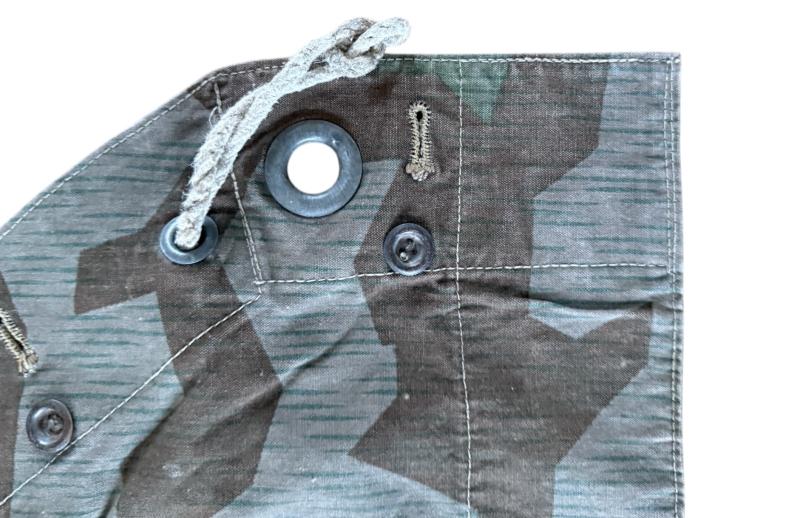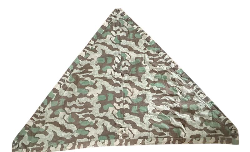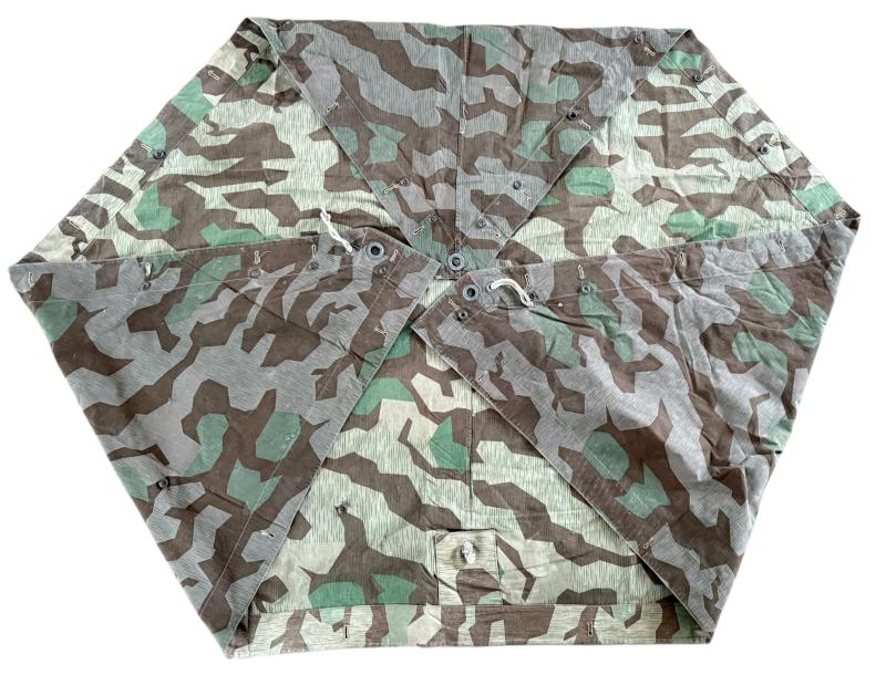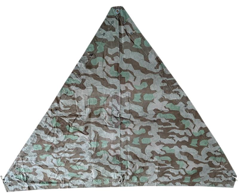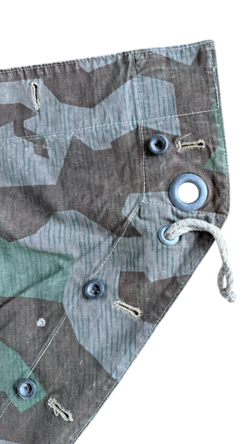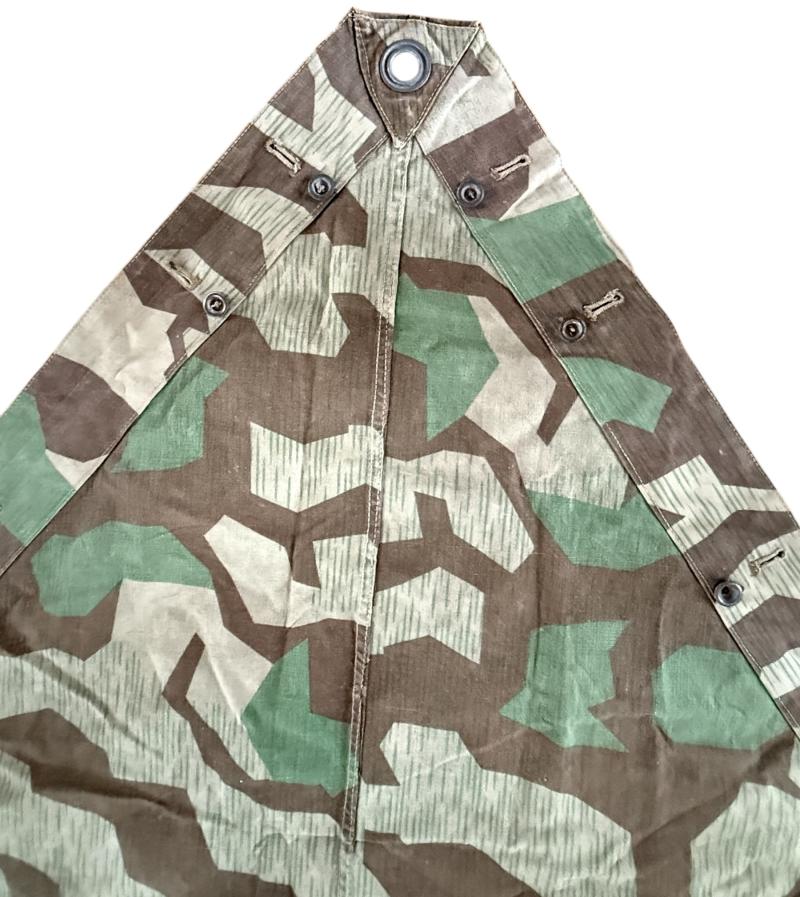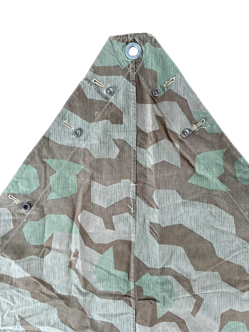 WH (Heer) M31 Shelter Quarter (Zeltbahn 31). Executed in "splitter pattern" camouflage. The shelter quarter shows usage and age but overall in nice used condition. The Zeltbahn is nice late war dated 1944 dated and marked with RBN number. A nice used WH (Heer) Zeltbahn 31 with great patina.