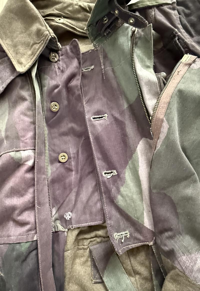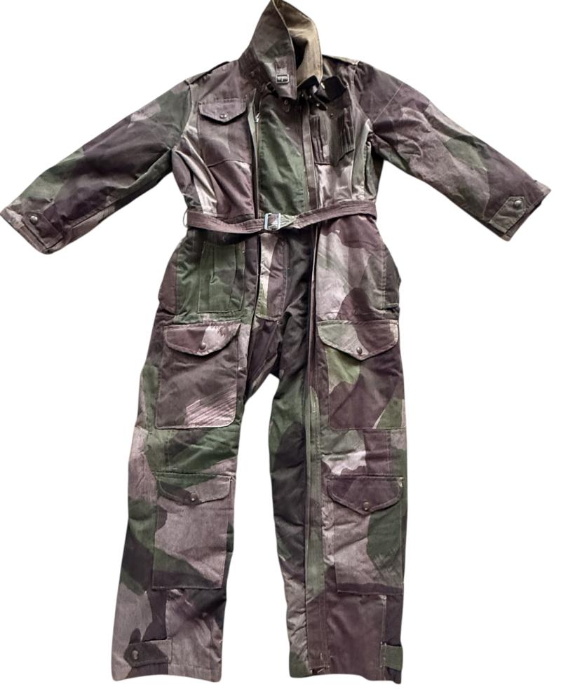 A rare example of a British Army Camouflage Tank Suit with hood. The suit is unissued condition and stone mint. Fitted with clear and crisp label, dated 1945 and size 3 (36-38 inch breast, waist 32-34, leginseam 31inch). This pattern of tank suit was introduced in 1944 The suit is complete and fitted with full working zip.and orginal hood The camouflage has deep and colours. A highly attractive and large size British Army Camouflage Tank Suit that cannot be upgraded.