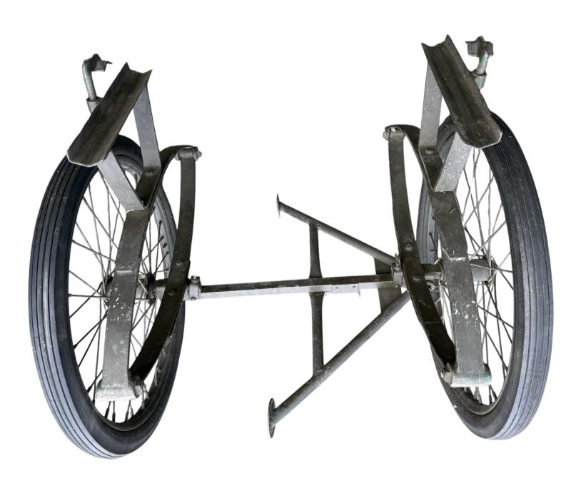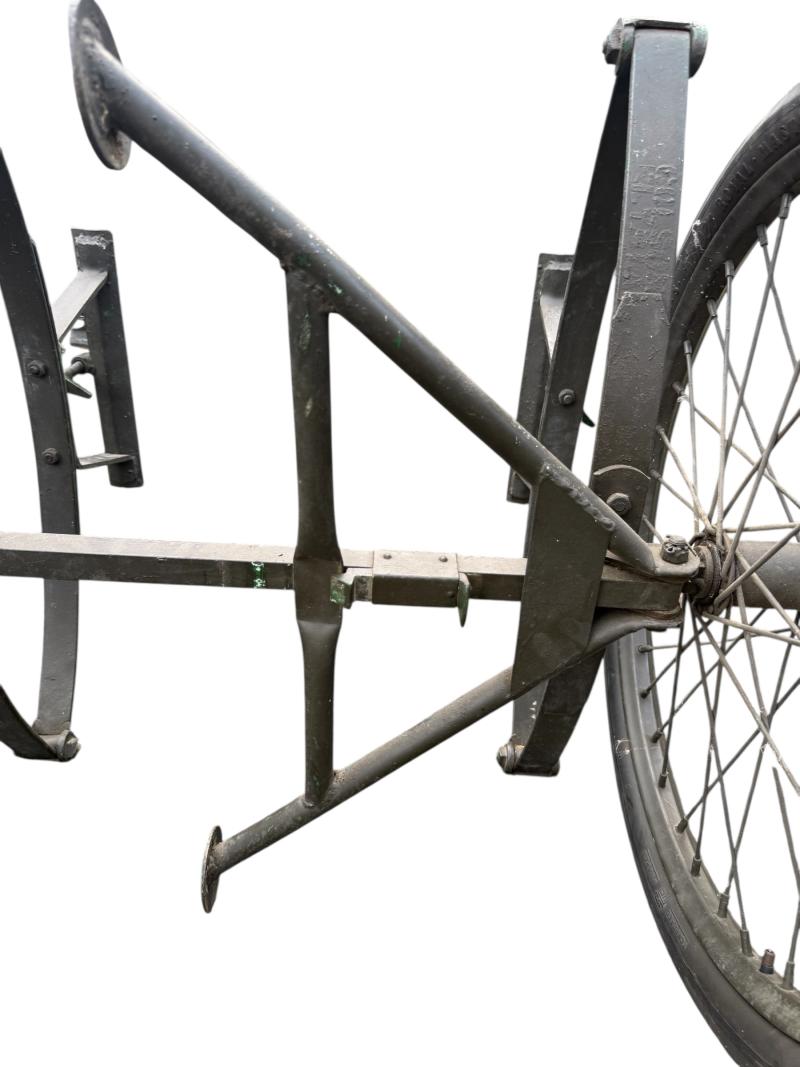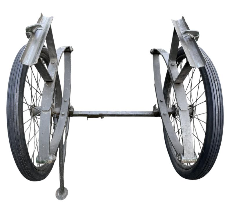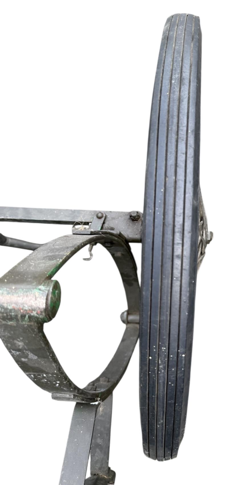 The carrier was designed as a collapsible 2-wheeled cart for carrying one loaded litter (stretcher) over long distances. Fitted with two wheels and a weight of around 59 pounds i.e. near 27kg. Although no visible makers marke these carts were only produced by a few manufactorers such as Best Metal Products, Inc., Long Island City, New York, Dayton Wheel Co, Dayton, Ohio, and the Jerald Sulky Co., Waterloo, Iowa. These carriers would have been used in both field hospitals as closer to the frontline within the European theatre of operations. The carrier is in good working order and nice used overpainted condition.and comes with the orginal 26 X2.125 U.S.Sniper Tyres