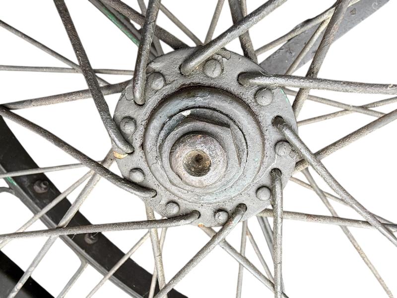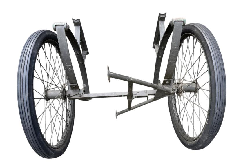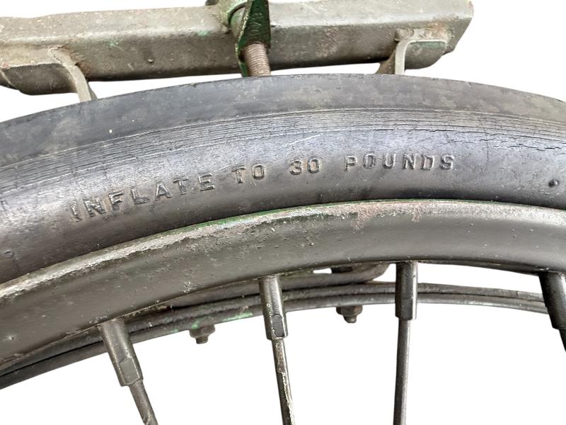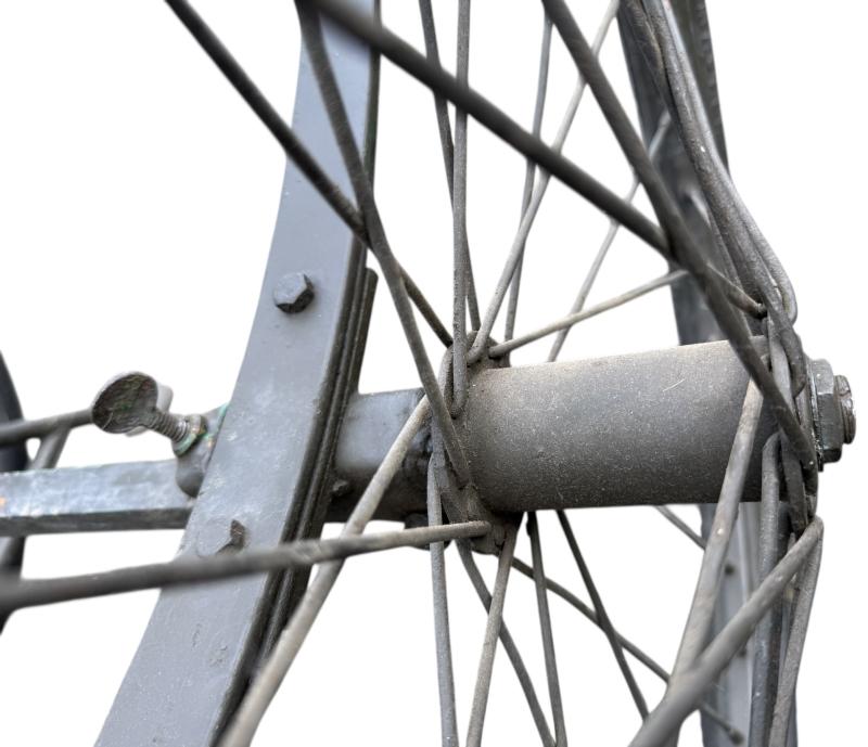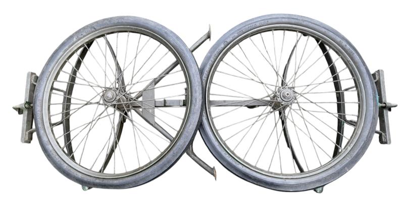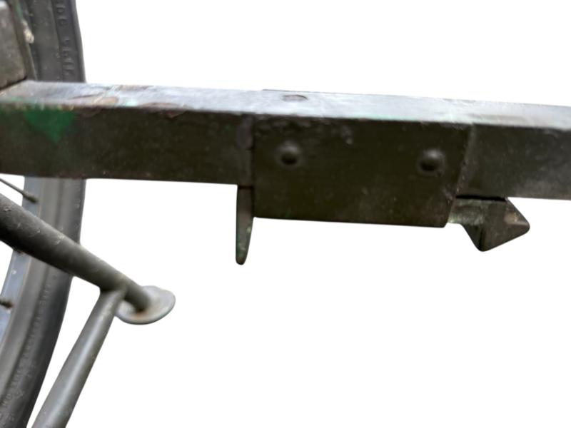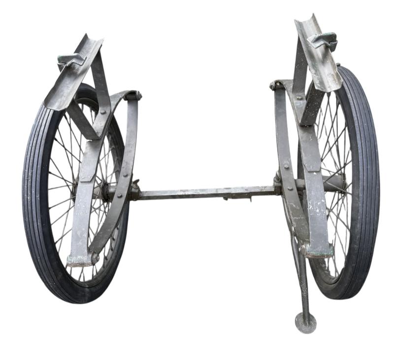 The carrier was designed as a collapsible 2-wheeled cart for carrying one loaded litter (stretcher) over long distances. Fitted with two wheels and a weight of around 59 pounds i.e. near 27kg. Although no visible makers marke these carts were only produced by a few manufactorers such as Best Metal Products, Inc., Long Island City, New York, Dayton Wheel Co, Dayton, Ohio, and the Jerald Sulky Co., Waterloo, Iowa. These carriers would have been used in both field hospitals as closer to the frontline within the European theatre of operations. The carrier is in good working order and nice used overpainted condition.and comes with the orginal 26 X2.125 U.S.Sniper Tyres