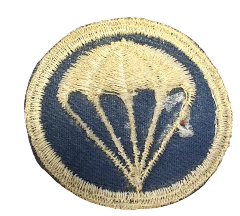 U.S. Airborne Parachute Infantry Cap Badge. Executed with embroidered parachute on a dark blue background. An excellent and nice used Garrison Cap Badge.