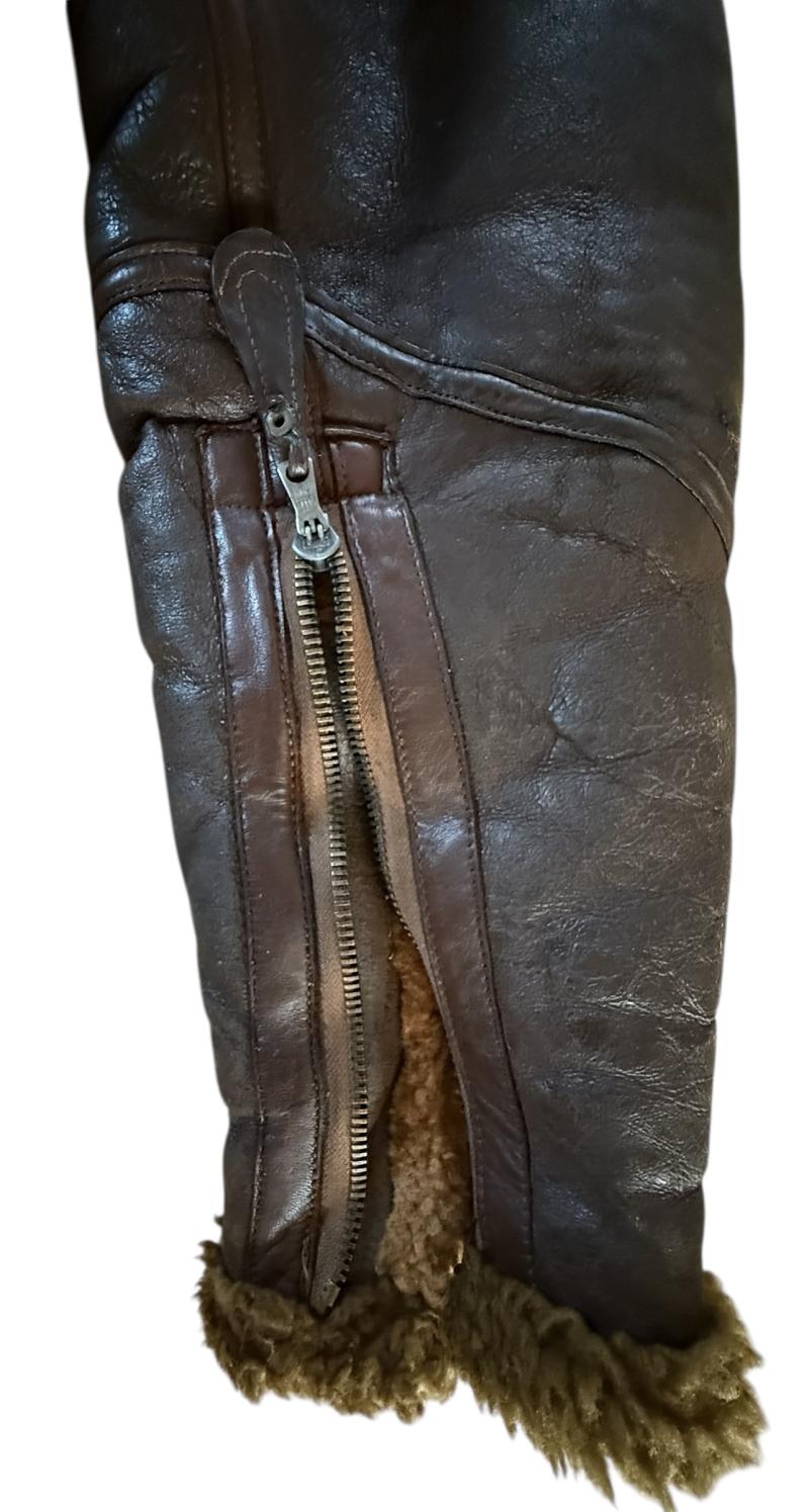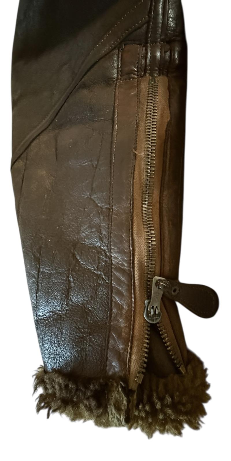 The jacket is fitted with original label and marked a size 4 (waist 32-34, height 5.8-5.9, breast 36-38). The label is marked with a Broad Arrow. The full lenght zip in working order and makers marked "Lightning", the smaller zippers on the arm are also in working order and compromise Air Ministry marked examples, marked with Kings Crown. The original leather waistband is also still present with the jacket. A highly attractive and wearable British Royal Air Force Irvin Flying Jacket.