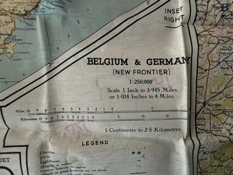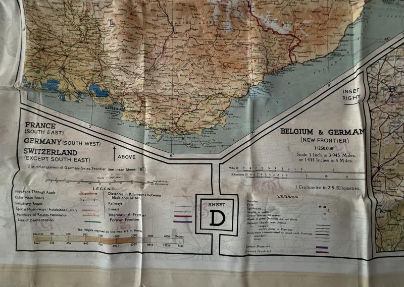 A nice used example of a British silk escape map. Compromising map D (Belgium & Germany) and F (Croatia, South Germany, Italy/Switzerland). These maps were British made but would also have been used by USAAF, RAF and SOE troops. With the silk map its original waterproof wallet, often displaced. A full original and nice used British Silk Escape Map And Escape Map Wallet.