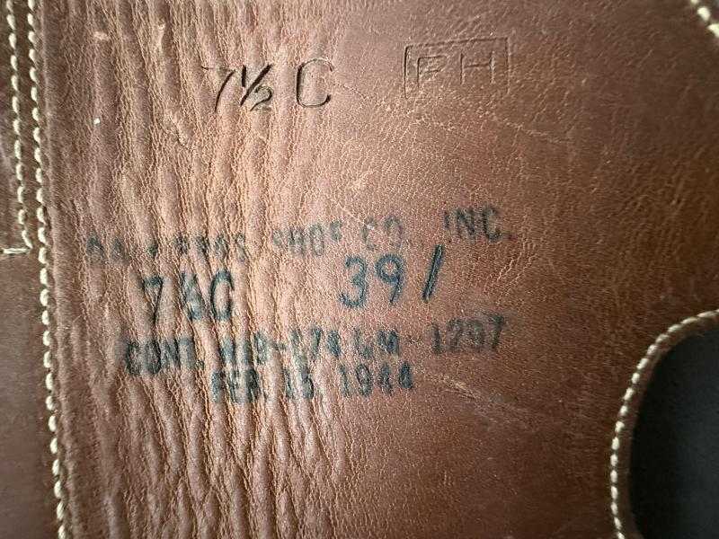U.S. M1943 Buckle Boots in excellent and imo mint condition. With minimal trace of wear to both the leather and the soles. The leather is in excellent subtle condition. The boots are clearly 1944 dated and sized 7 1/2 C. The soles are makers marked Goodyear. A stunning pair of U.S. M1943 Buckle Boots that cannot be upgraded.