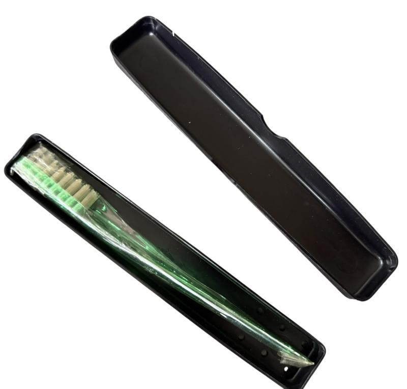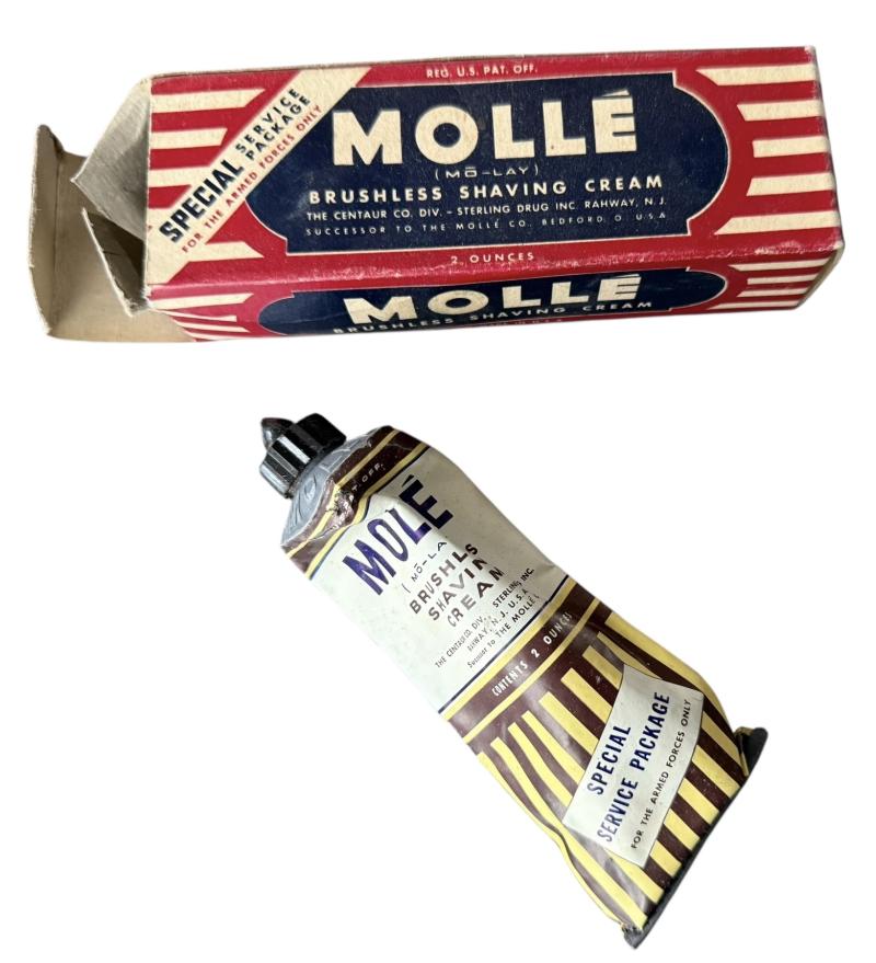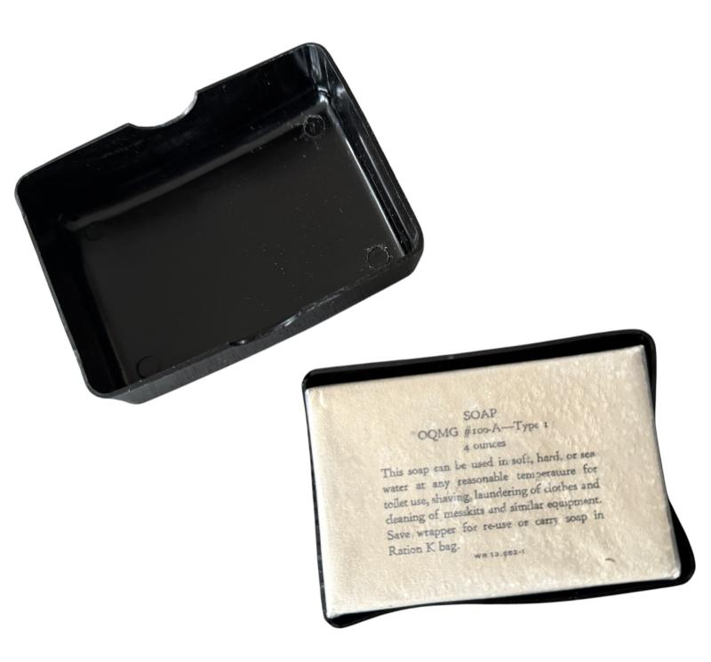 A complete U.S. Washroll i.e. appron.Complete with Barbasol beard softener, Rubberset shaving brush, mirror, toothbrush and box teeth powder,pinset,comb, aswell as a soap box.with soap With the washroll set comes a complete sewing kit i.e. "house wife" complete with all original contents such as yarn, scissors etc. In unissued condition and overcomplete therefore hard to be upgraded.