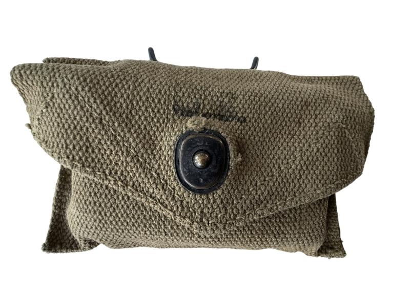 U.S. M1942 First Aid Pouch. Executed in canvas and makers marked B.A.B. CO. U.S. marked on the front. The date is hard to read yet imo 1942. Fitted with original Carlisle Dressing. In overall nice used condition.