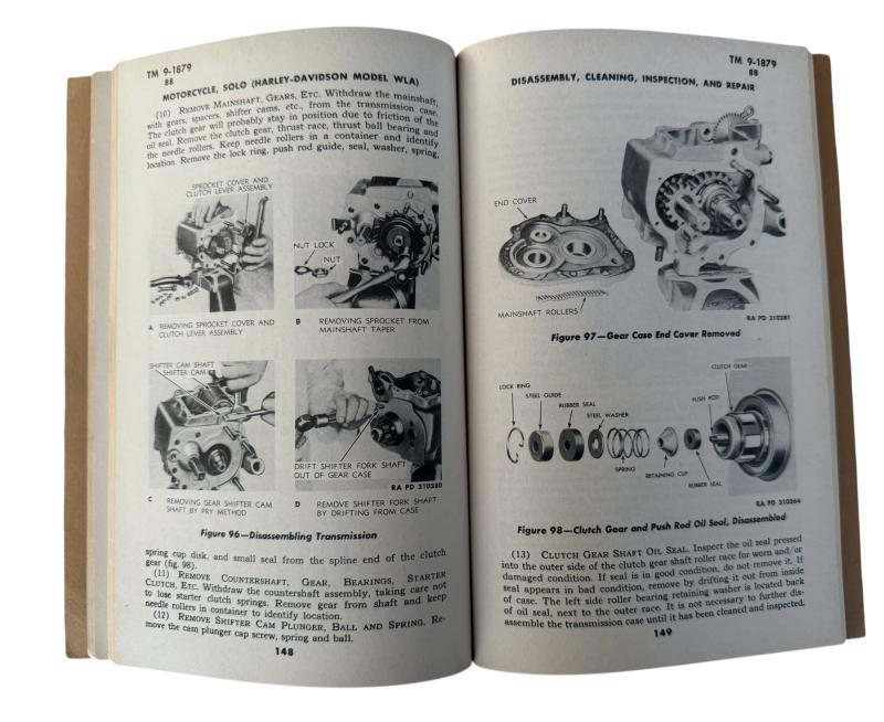 TM 9-1879 Technical Manual for Harley-Davidson Model WLA. Published by the War Department in March 1944. This technical manual is in nice used condition Hard to upgrade.